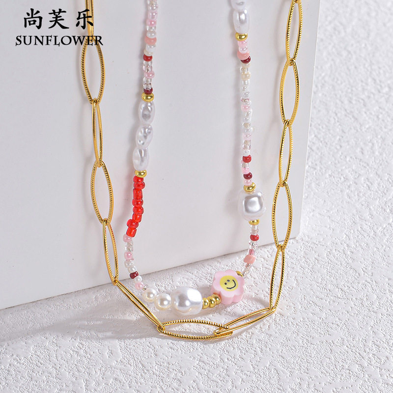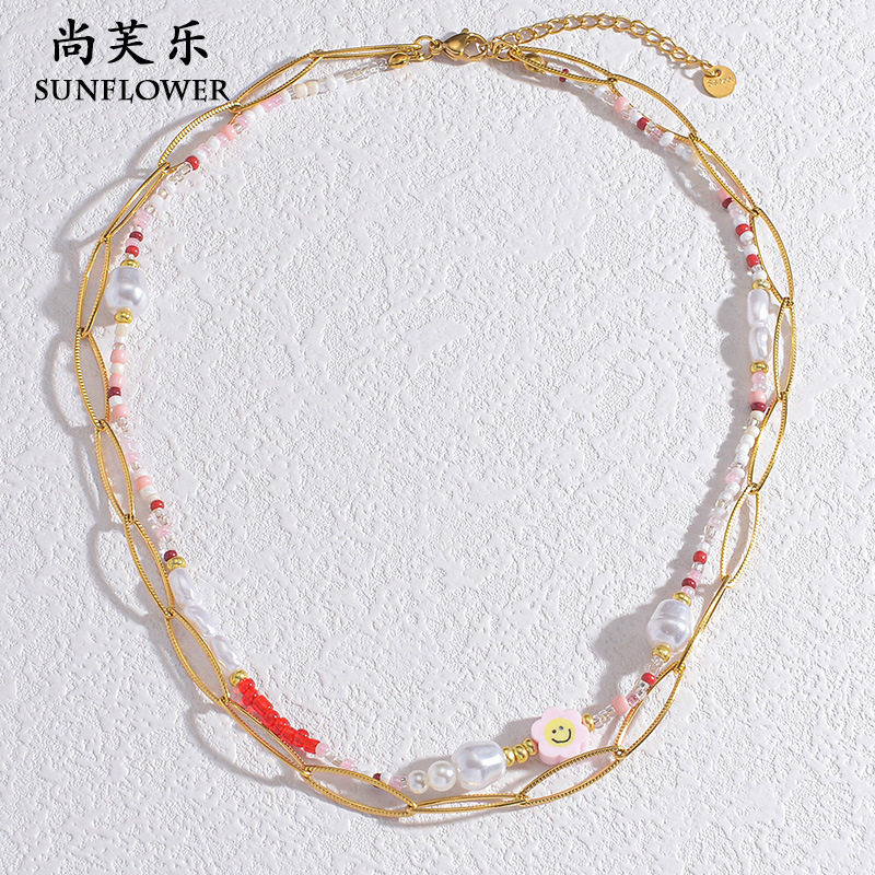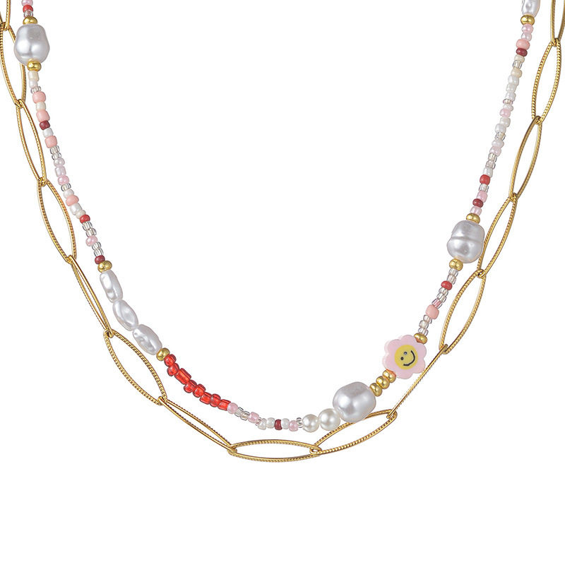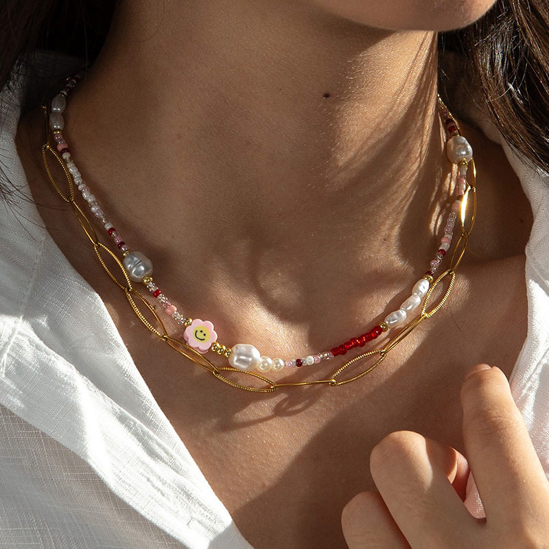 跨境爆款彩色串珠珍珠项链女钛钢轻奢小众压花椭圆锁骨链优雅饰品