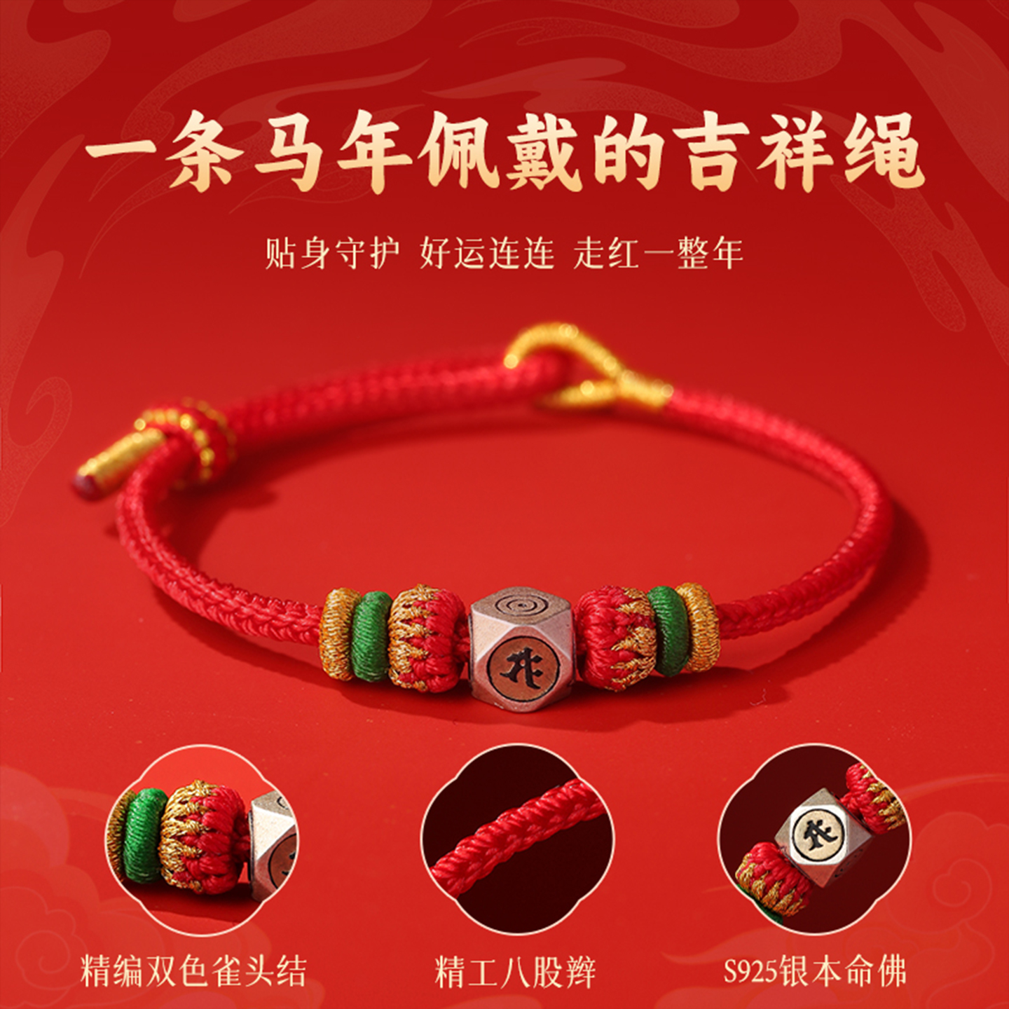 2026马年本命年红绳手链女款纯银本命佛太岁护身红色手绳编织绳男