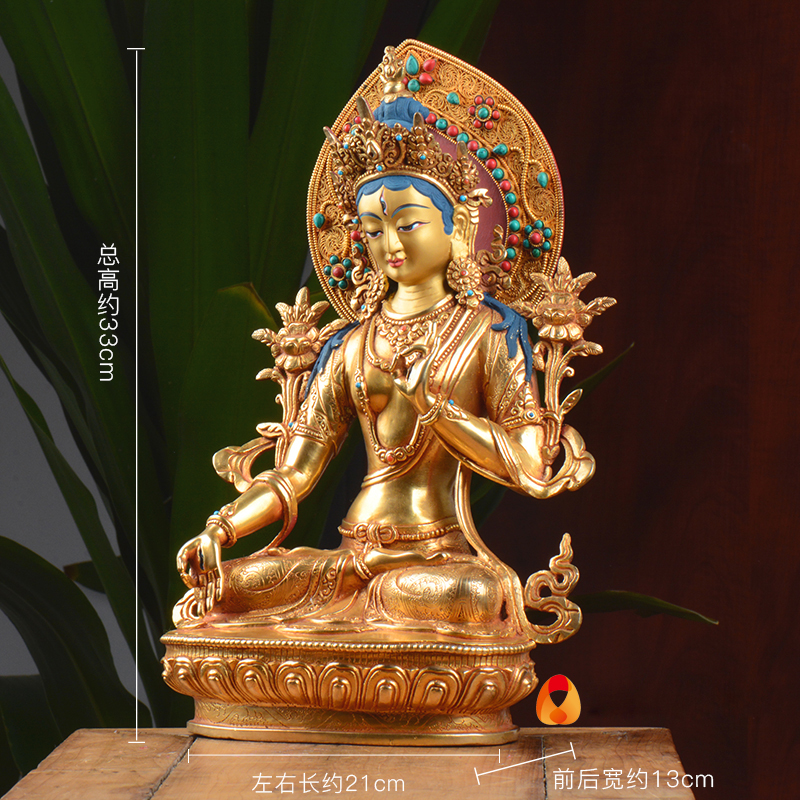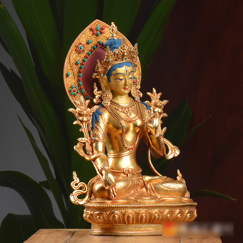 尼泊尔手工掐丝雕花铜鎏金10寸藏密桌面铜像白度母铜像