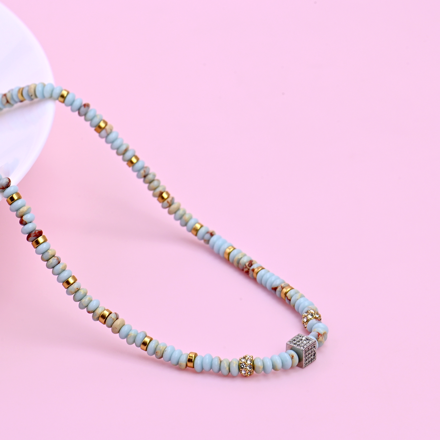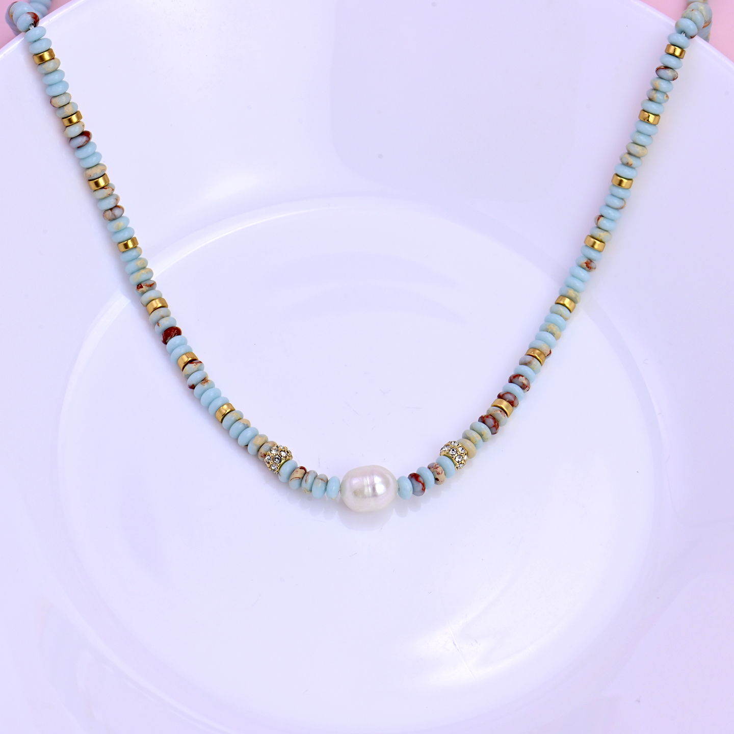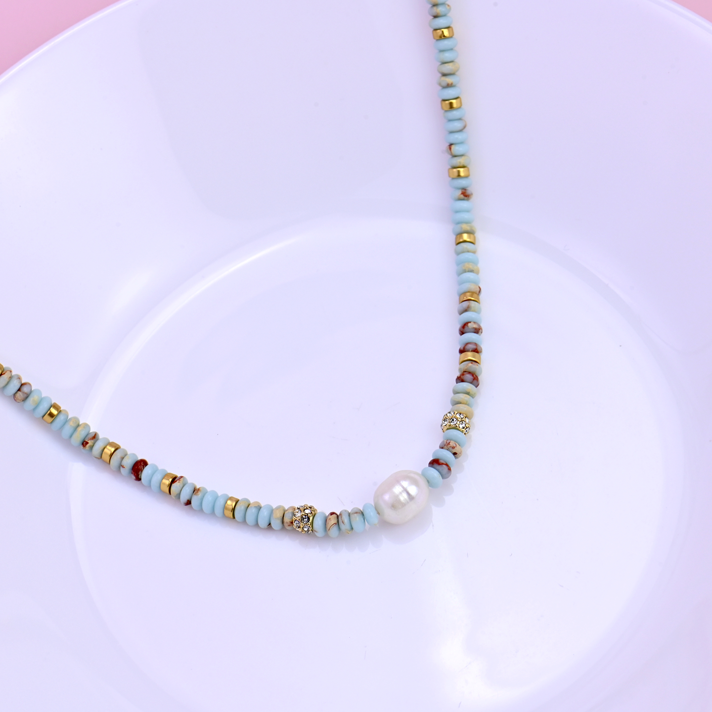 小众轻奢时尚气质百搭优雅淡蓝色串珠设计感镶钻质感天然珍珠项链