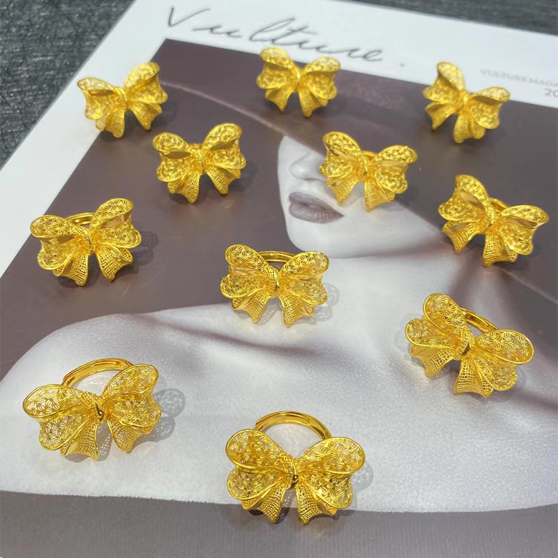 5G黄金蝴蝶结戒指女足金999可调节活口镂空指环显大个性范食指戒