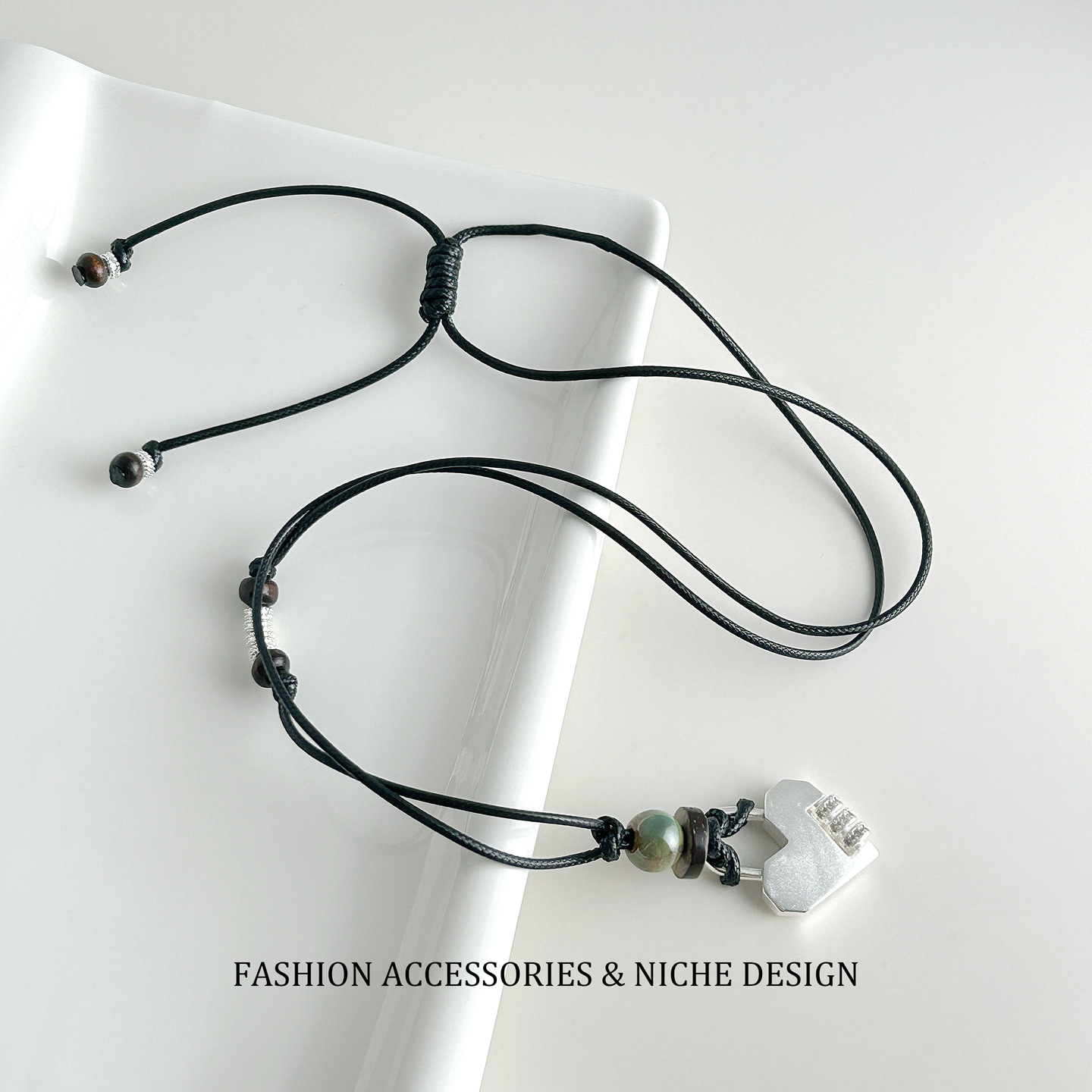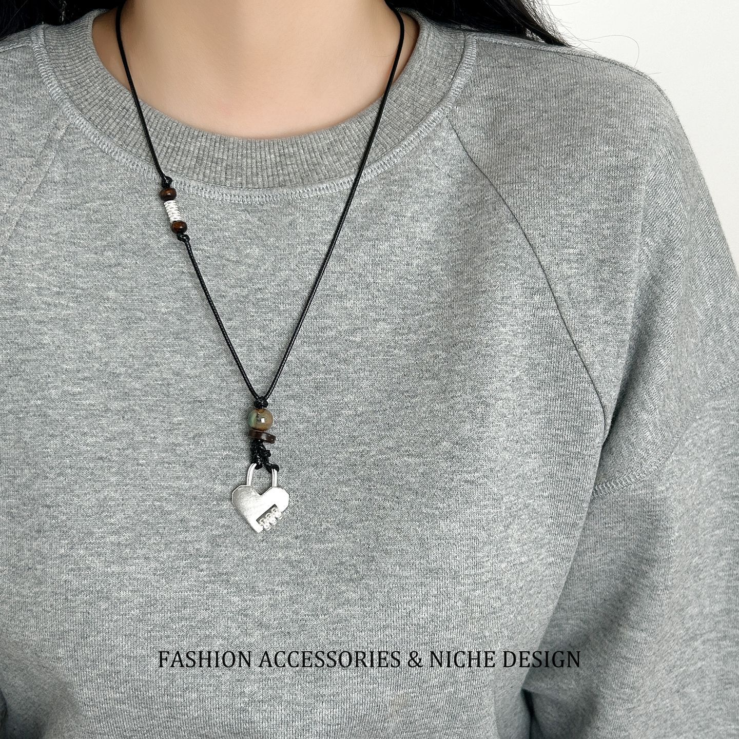 复古做旧银爱心锁吊坠项链女手工编织黑绳个性小众设计感颈链