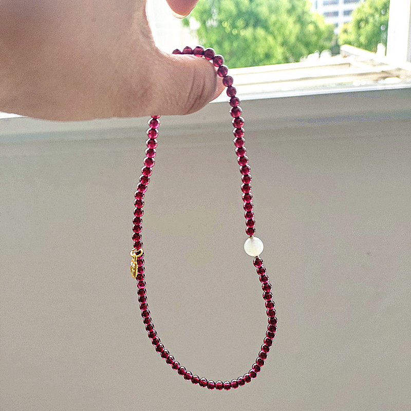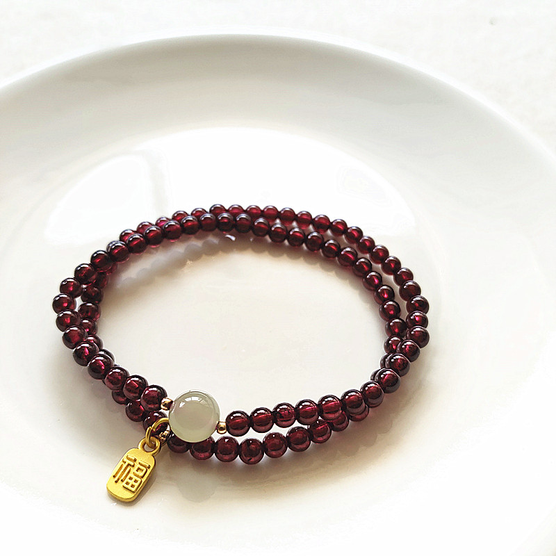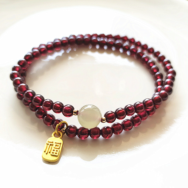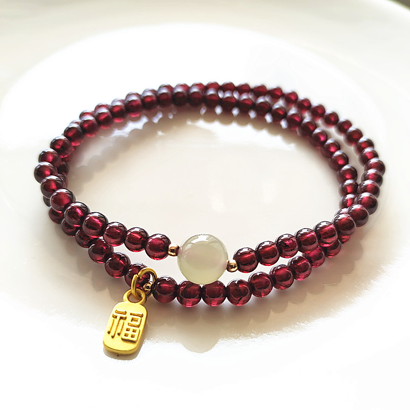 天然石榴石手链和田玉转运珠三圈手串女招财纳福复古手饰双圈手串