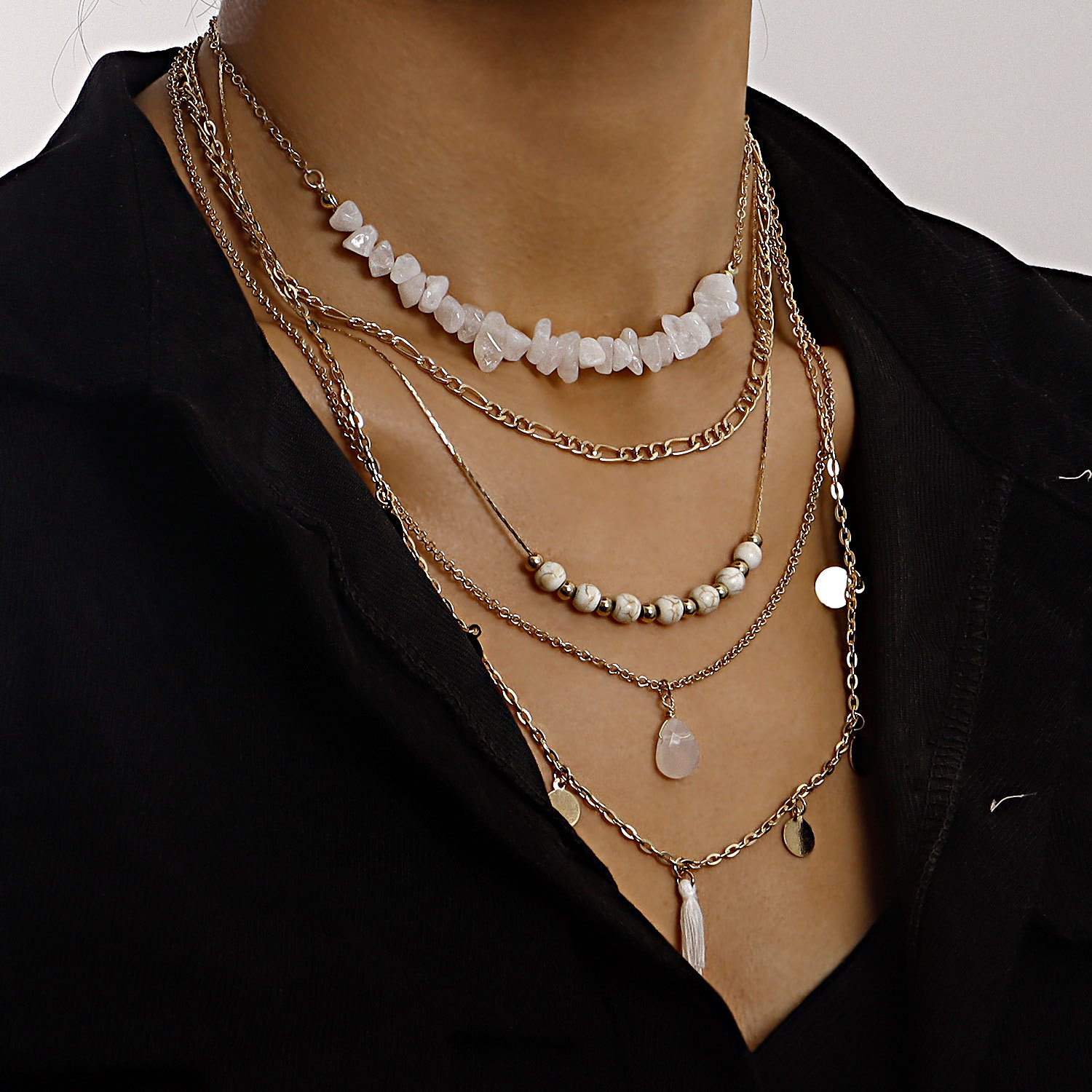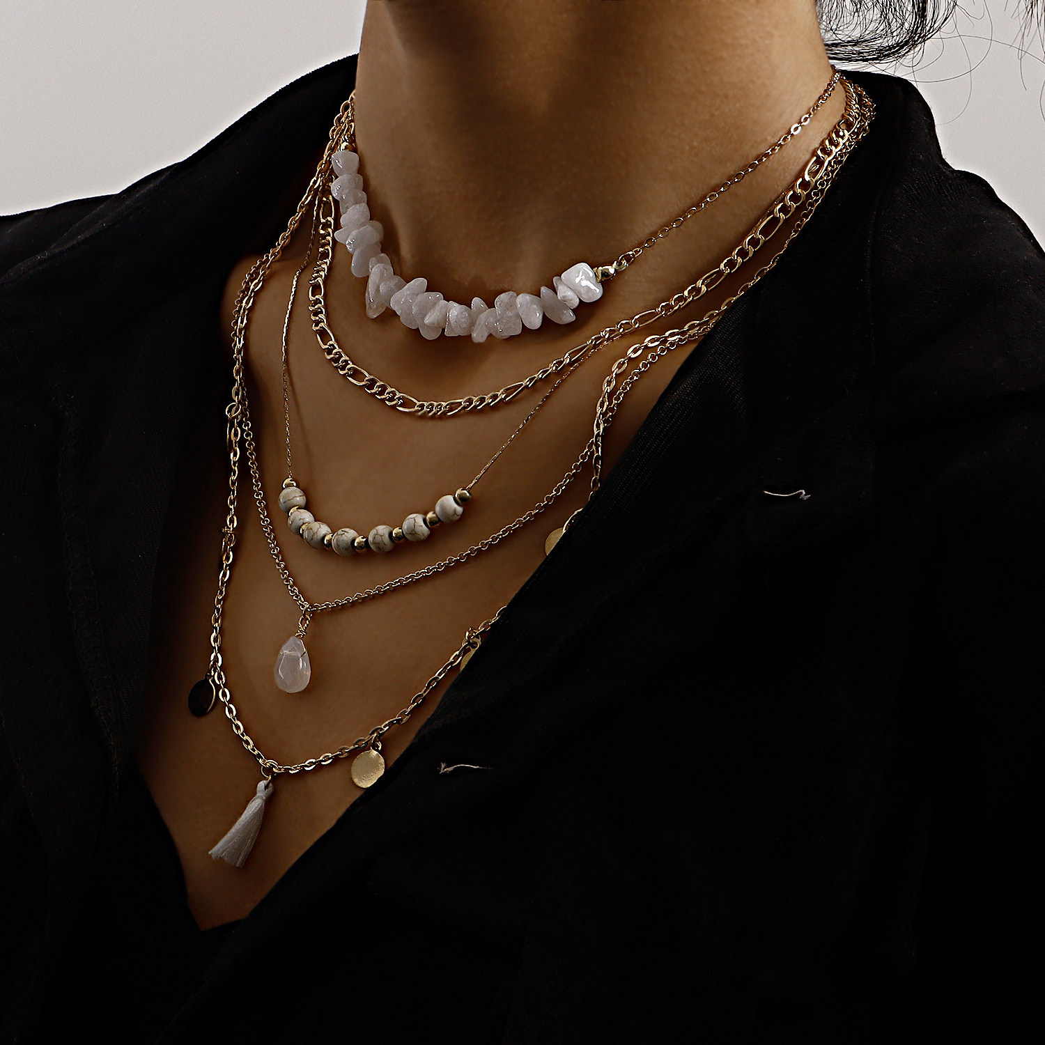 欧美饰品复古潮流多层白色松石锁骨链项饰女创意圆片流苏项链
