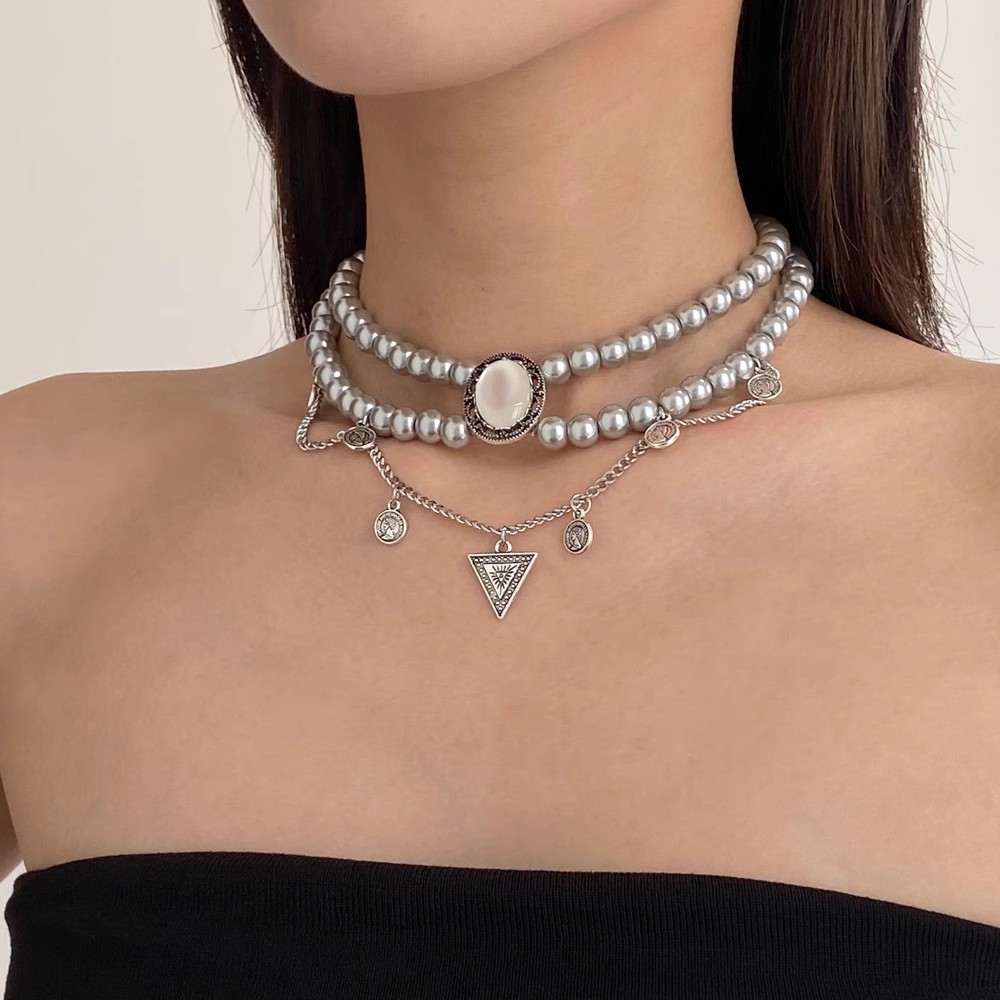 法式复古双层叠戴灰色珍珠项链女小众设计感民族风宝石锁骨链颈链