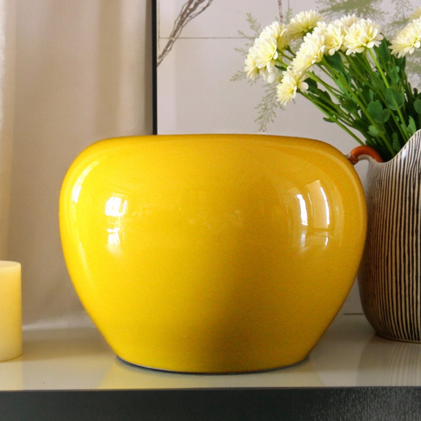 景德镇陶瓷黄色聚宝盆花瓶摆件桌面收纳罐子无盖圆形花盆招财瓷瓶