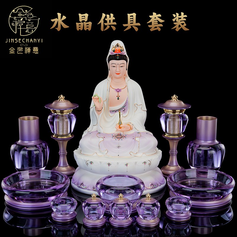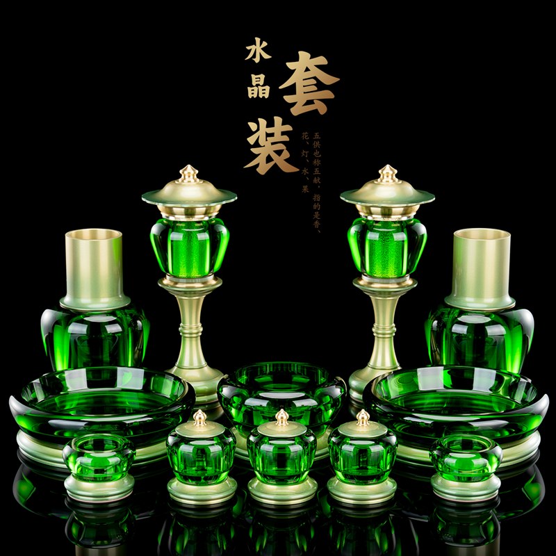 水晶佛具套装供佛用品家用全套套装供水纯铜杯香炉佛前灯果盘摆件