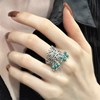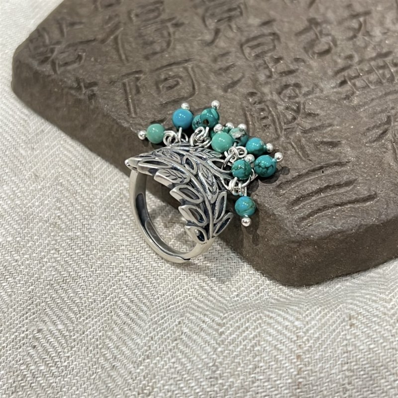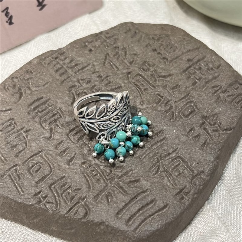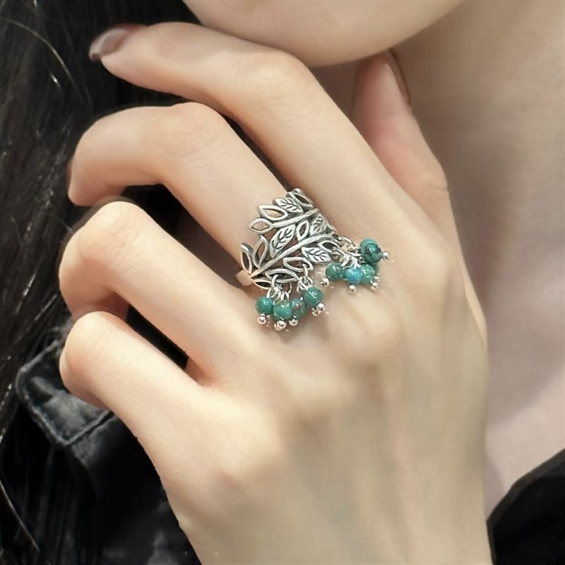 925银蓝松石花环戒指女新中式复古做旧叶子镂空开X口可调节指环