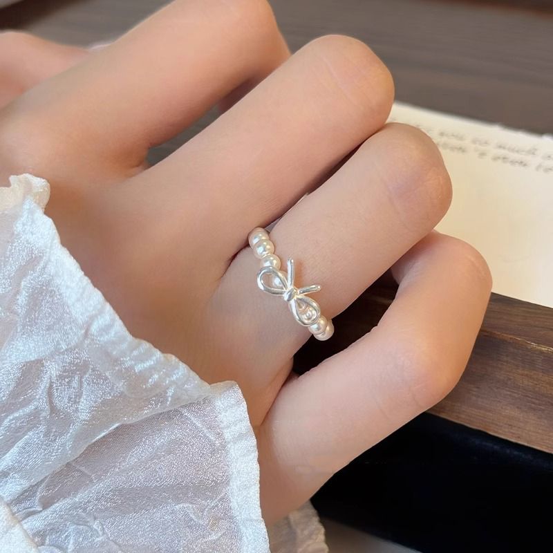 银色蝴蝶结珍珠戒指女轻奢高级感食指戒小众设计2025新款