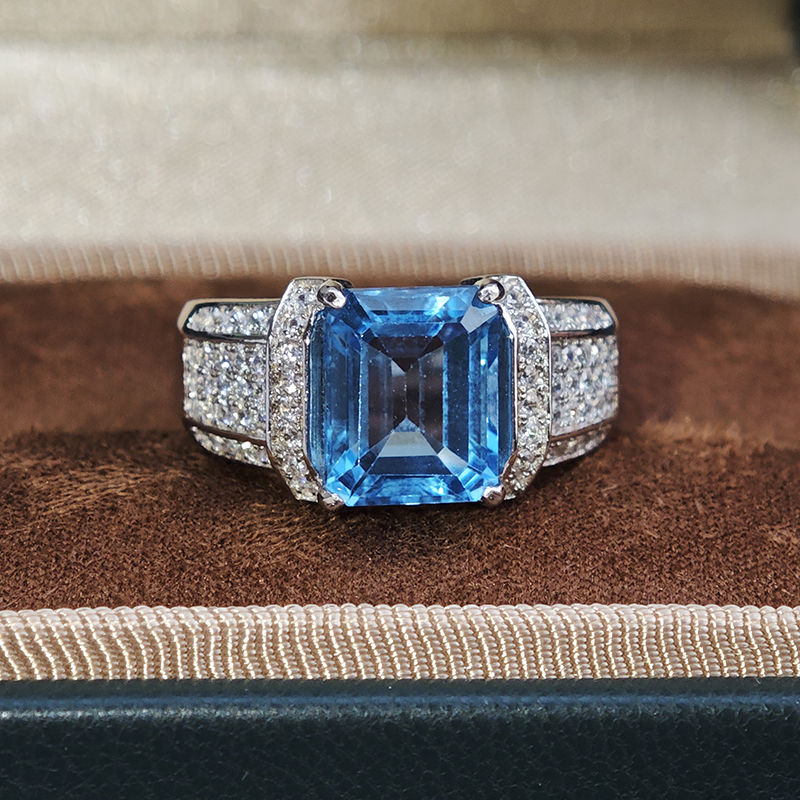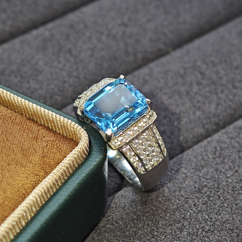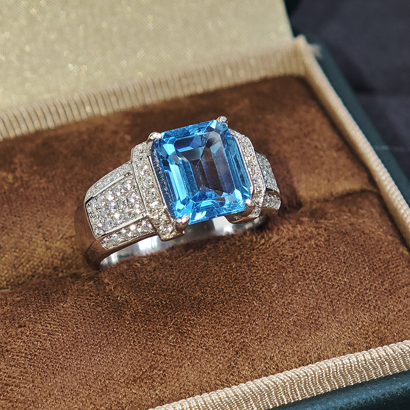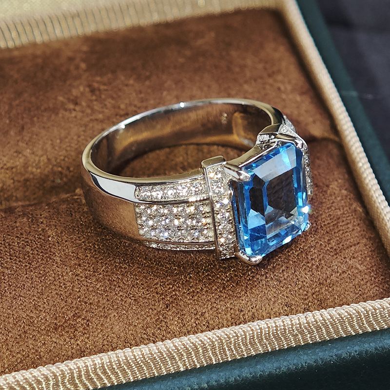 925纯银镀金瑞士蓝托帕石戒指男霸气潮男个性食指指环开口刻字