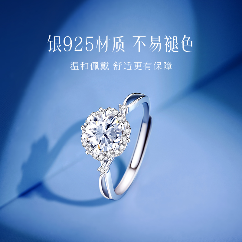 【中国黄金】珍尚银纯银一克拉莫桑石戒指求婚订婚礼物送女友S925