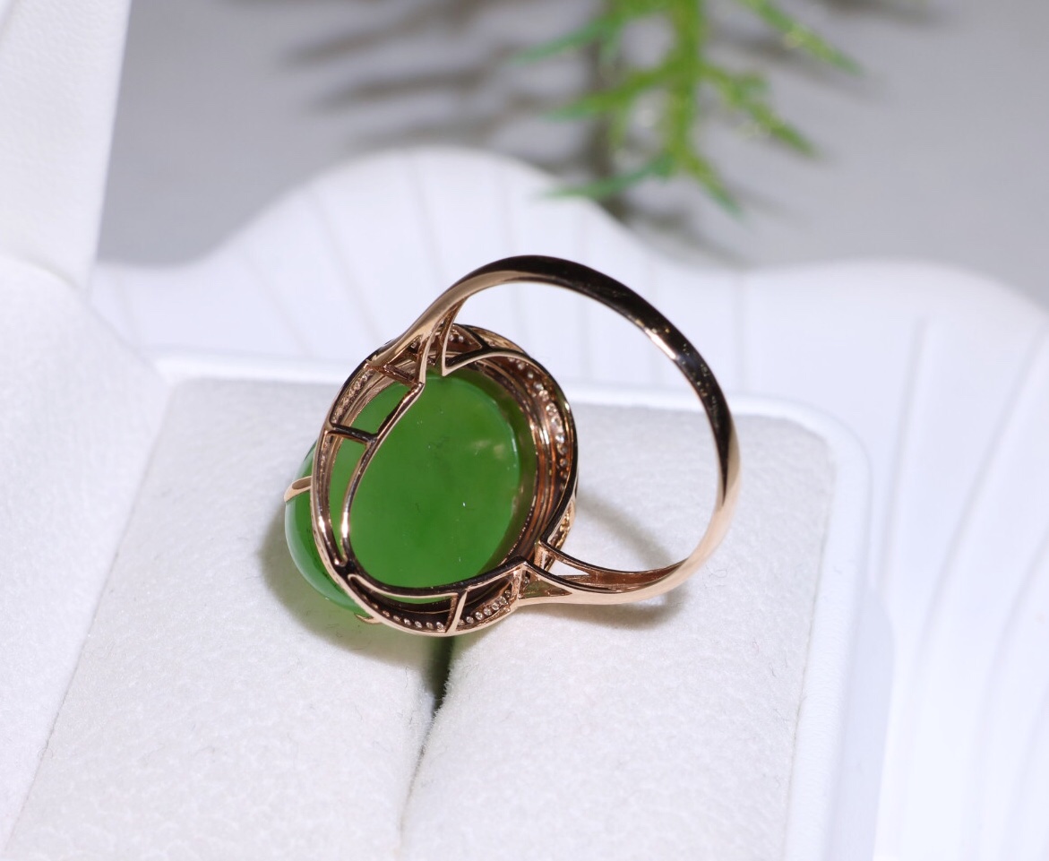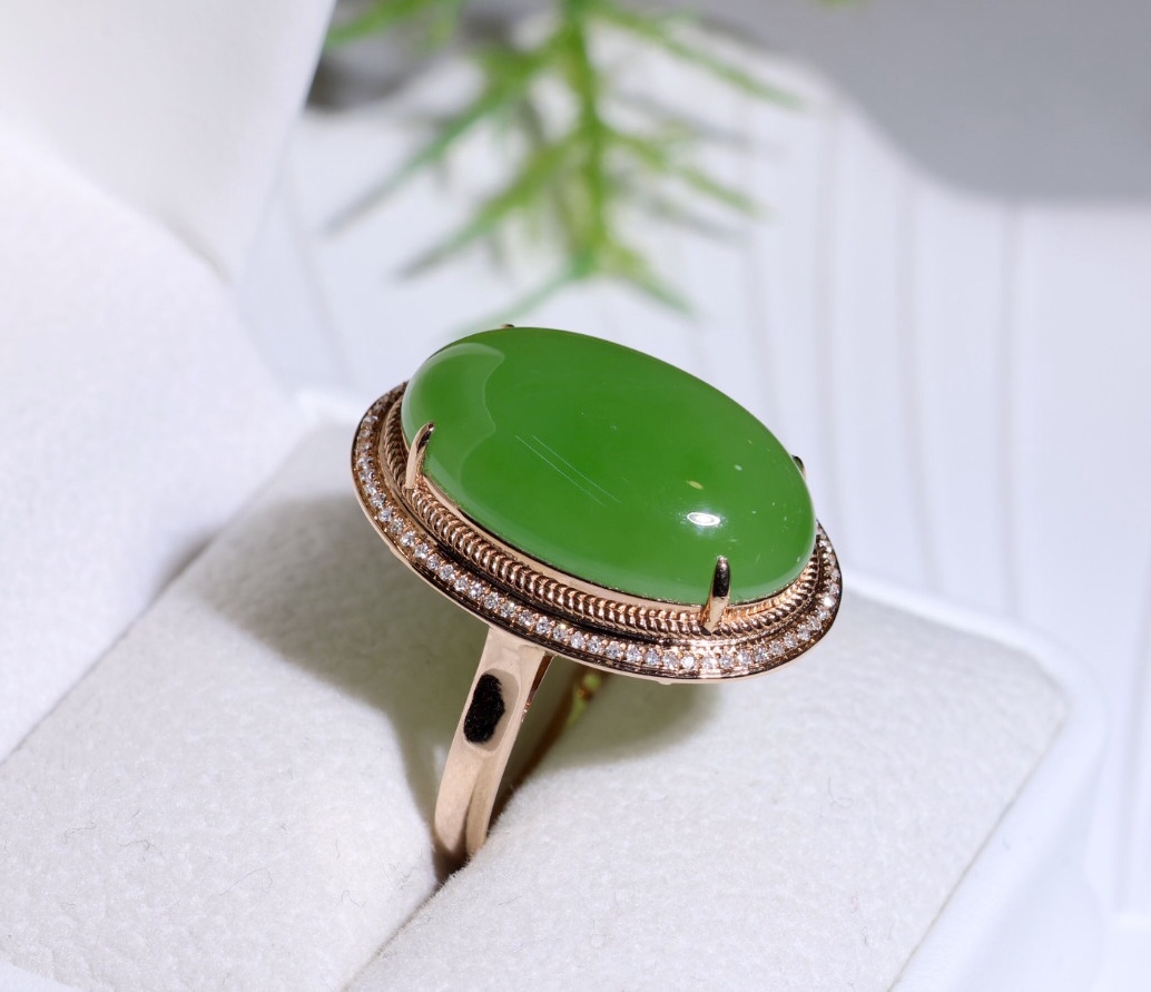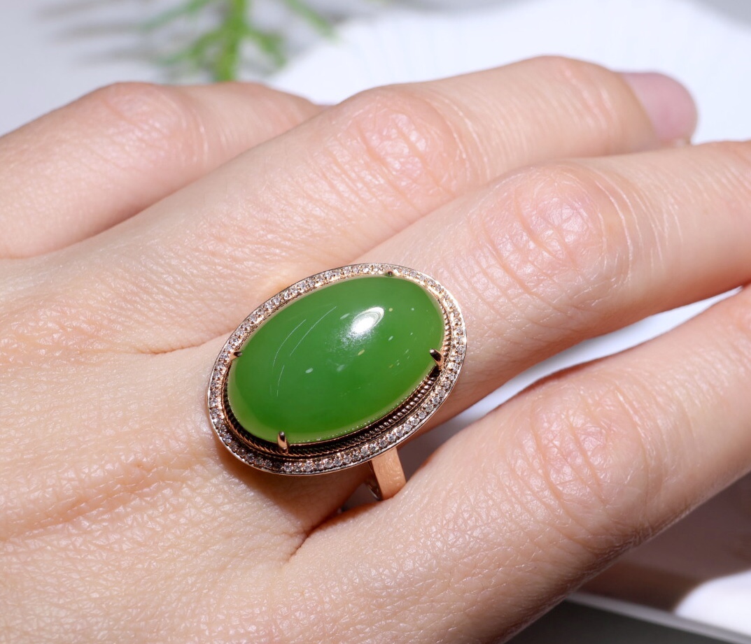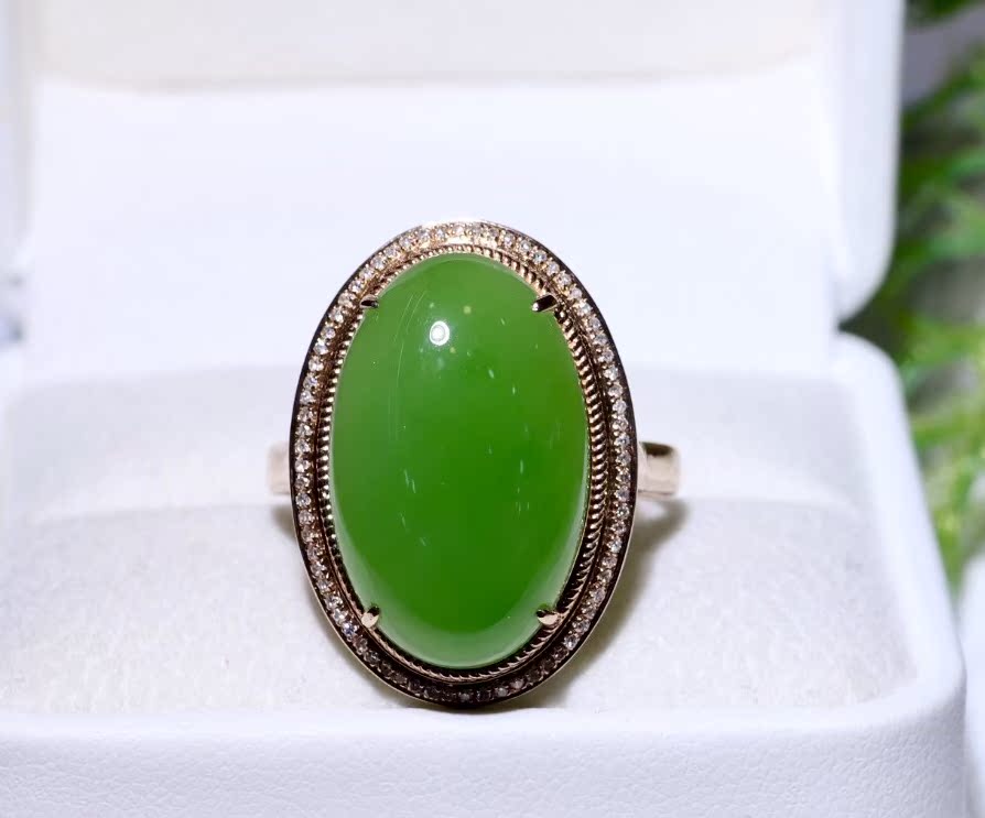 24年货节礼天然和田玉戒指女 满钻苹果绿碧玉大蛋面镶嵌18k金指环