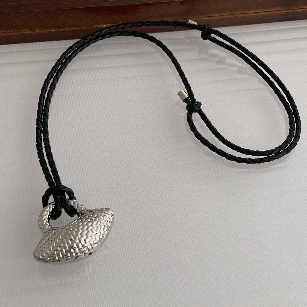 法式草编小包吊坠女金属轻奢高级小众编织皮绳绑带可调毛衣链项链