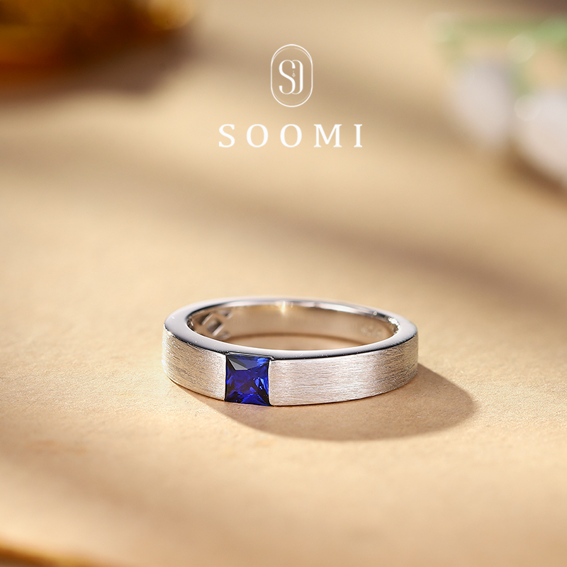 【SOOMI新贵】925银培育皇家蓝宝石戒指拉丝复古工艺简约戒环男