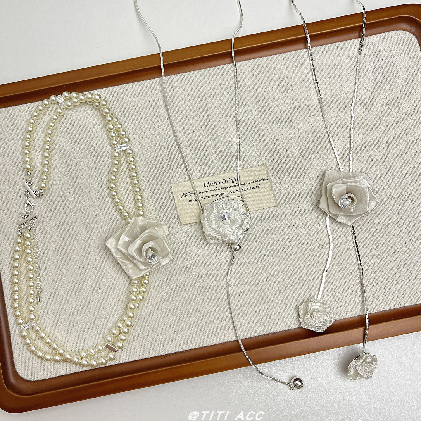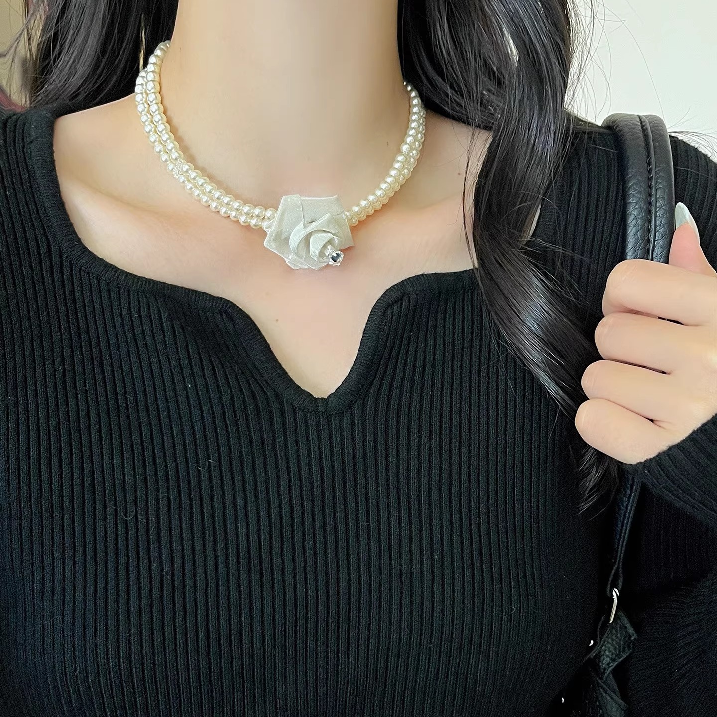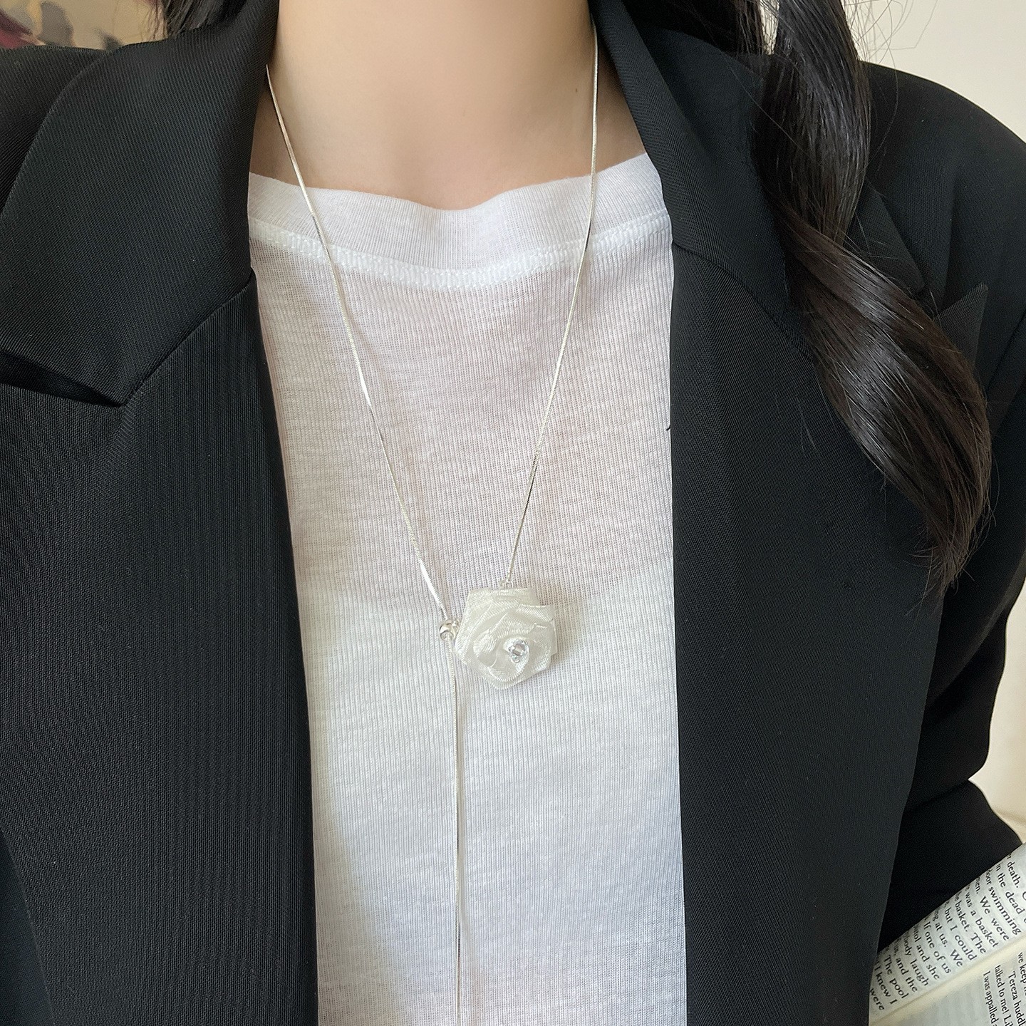 法式浪漫网纱白玫瑰多层珍珠抽拉长项链女独特绝美锁骨链优雅颈链