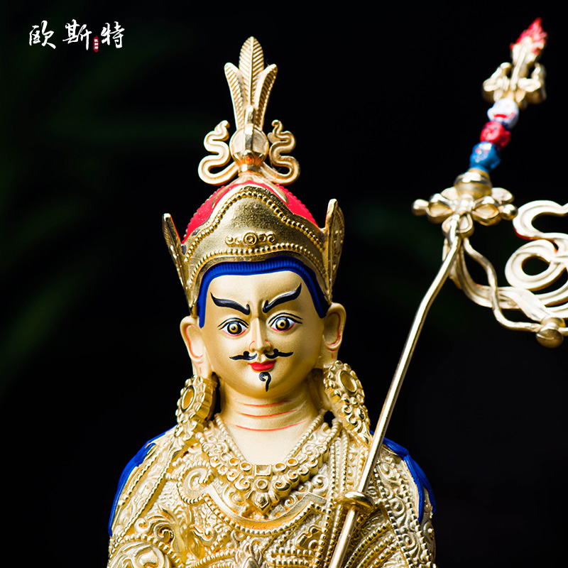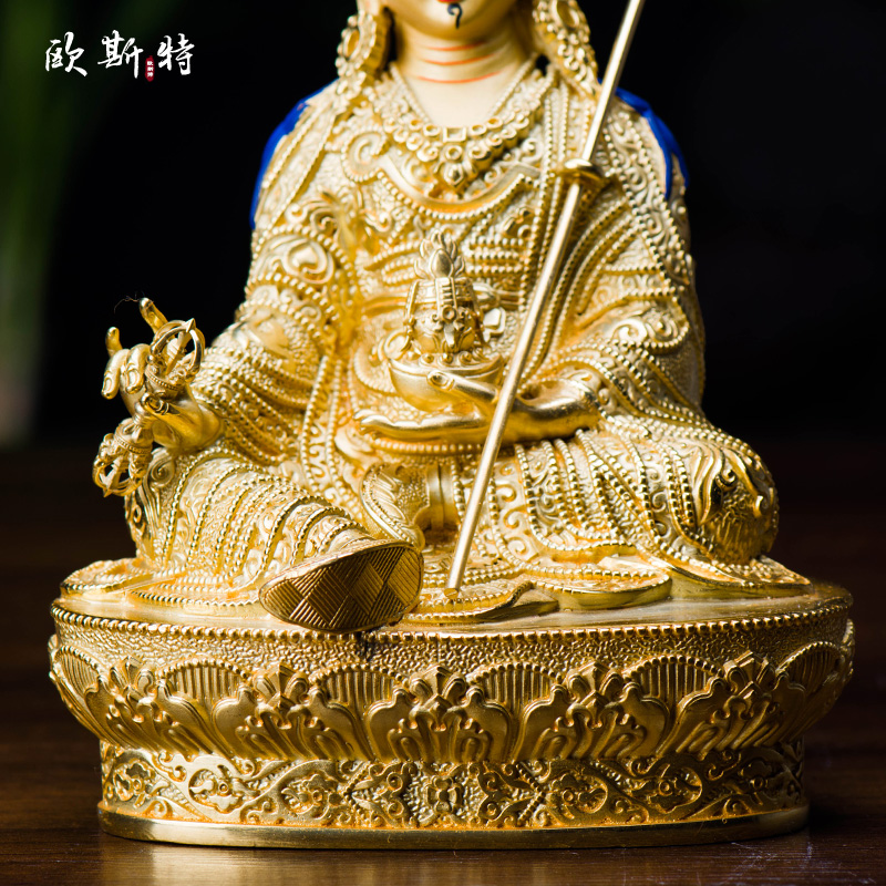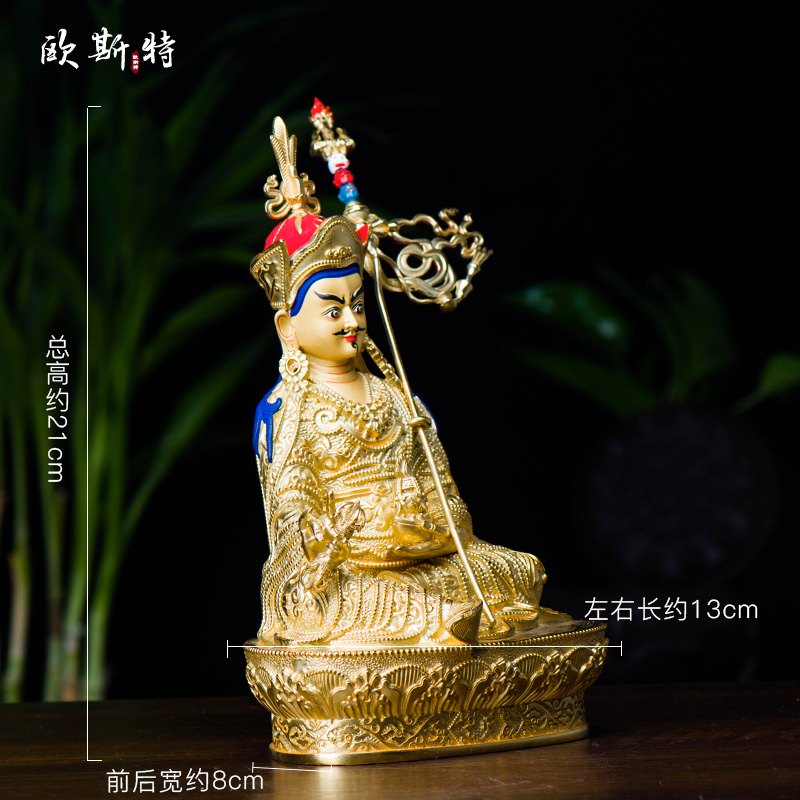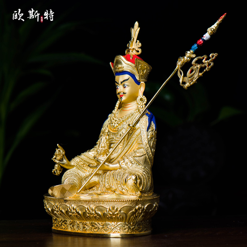 莲花生大士 西藏铜全鎏金雕花彩绘家居用品铜像7寸莲花生大师摆件