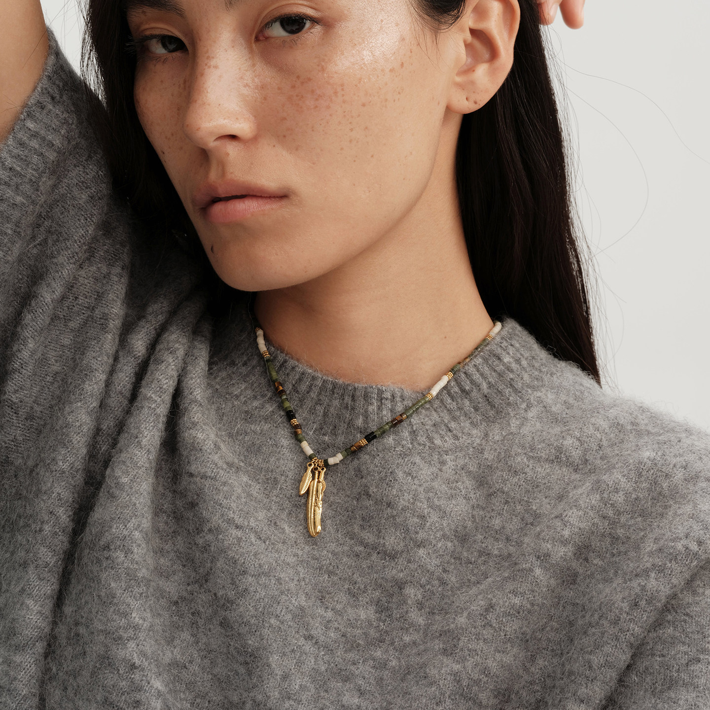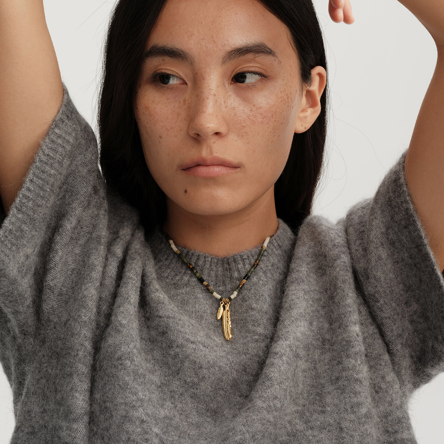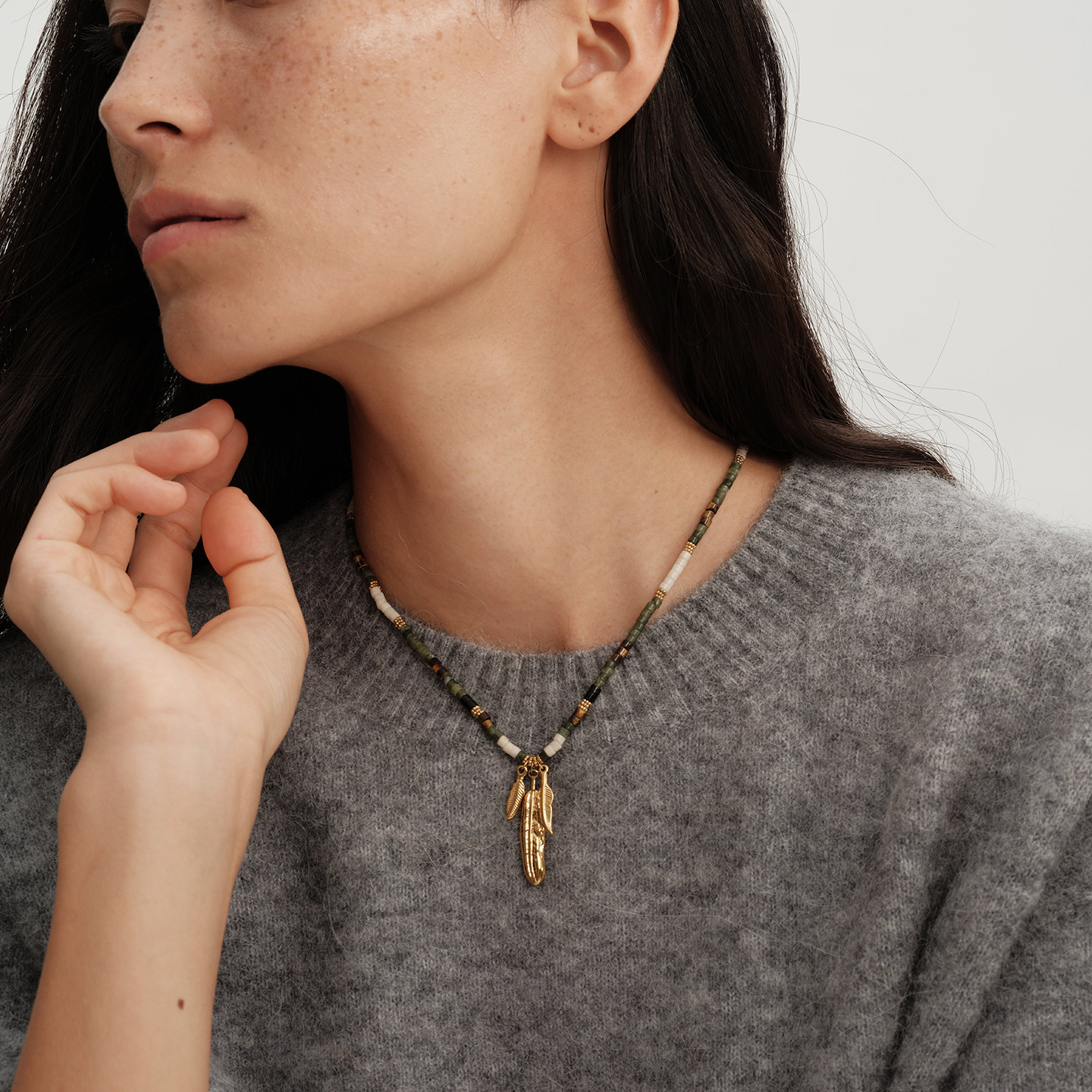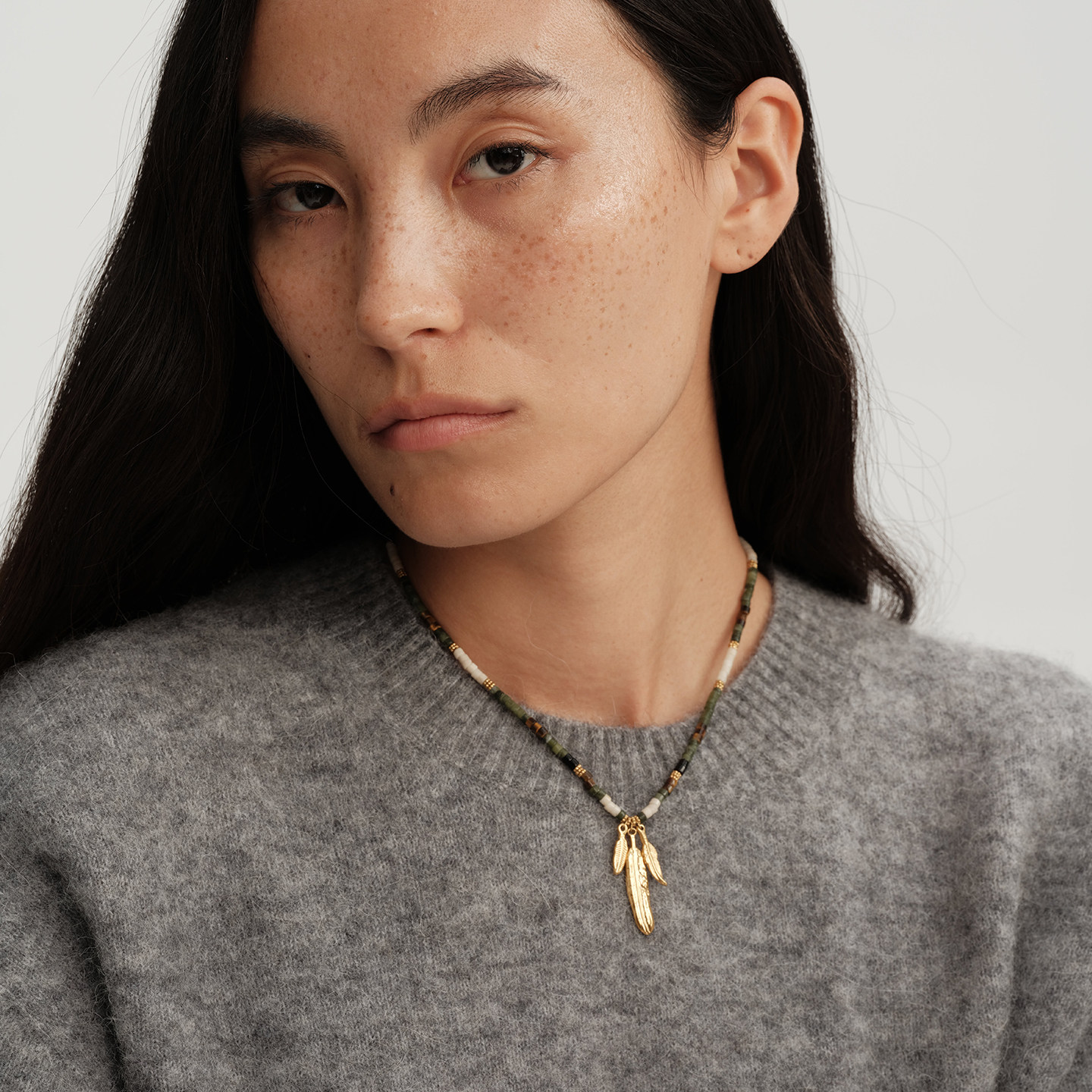 【CnHnOn脂肪商店】绿橄榄石串珠点缀金羽毛吊坠小众手工法式项链