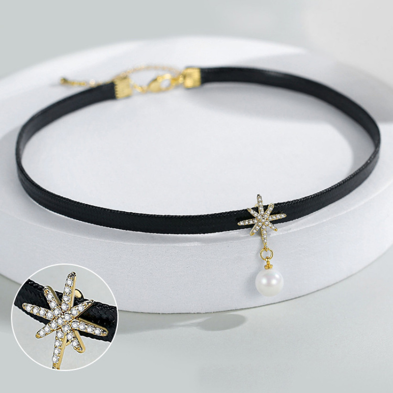 八芒星珍珠项圈女颈带choker短款脖子项链黑色锁骨链2025年新款潮
