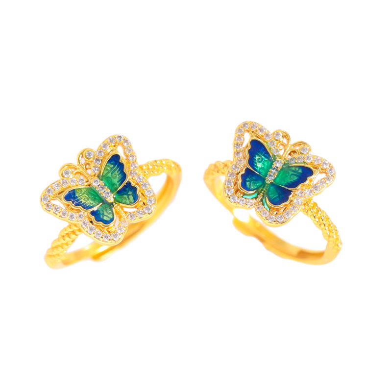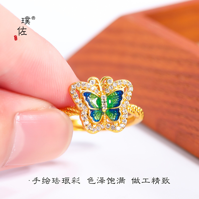 久不掉色古法沙金绿色镶钻蝴蝶戒指开口可调节手绘珐琅彩招财女