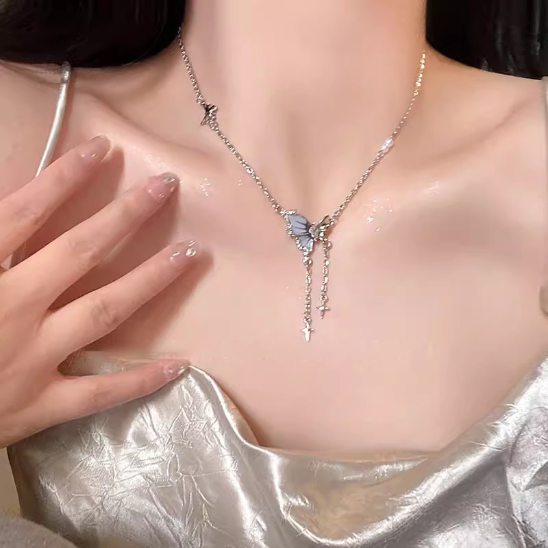 新款蓝色忧郁百搭气质长款流苏单翅膀蝴蝶项链高级设计锁骨链颈链