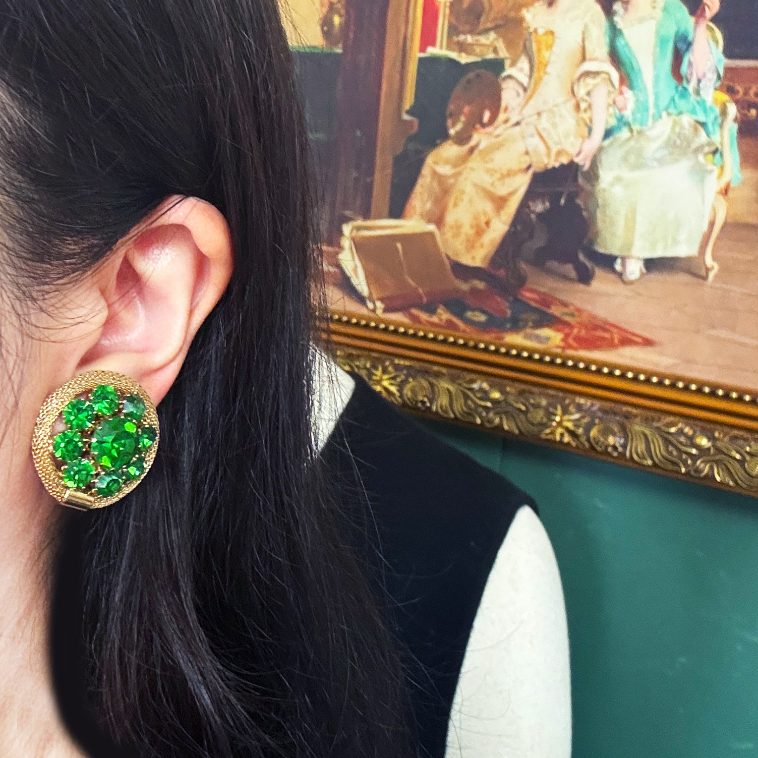 Vintage中古首饰50年代WEISS绿色奥地利水晶金属编织项链耳夹套装