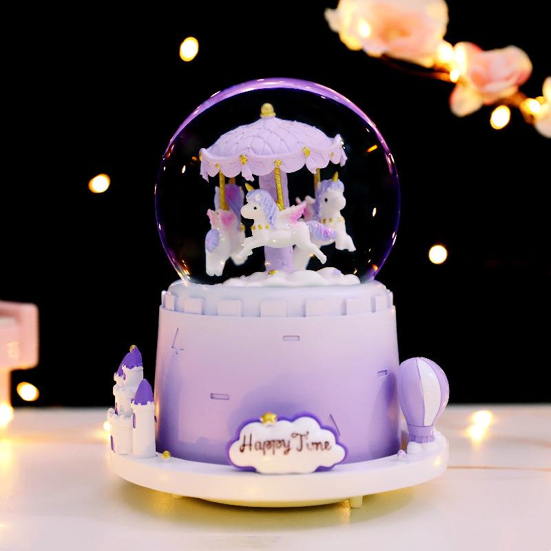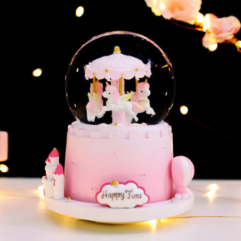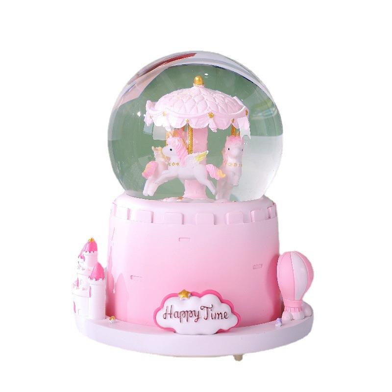 粉色旋转木马城堡特大号外旋转自动飘雪彩灯水晶球八音盒生日礼品