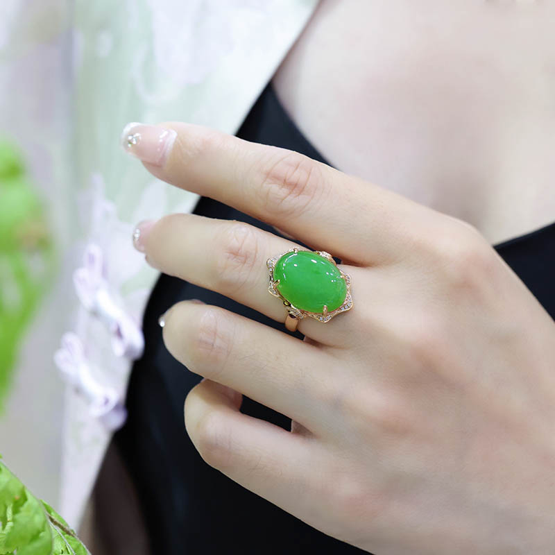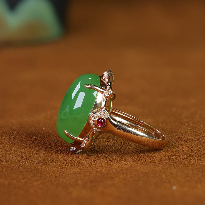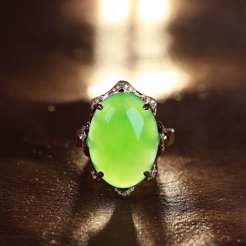 夏季促销天然和田玉戒指女苹果绿碧玉蛋面镶18k金指环送老婆