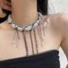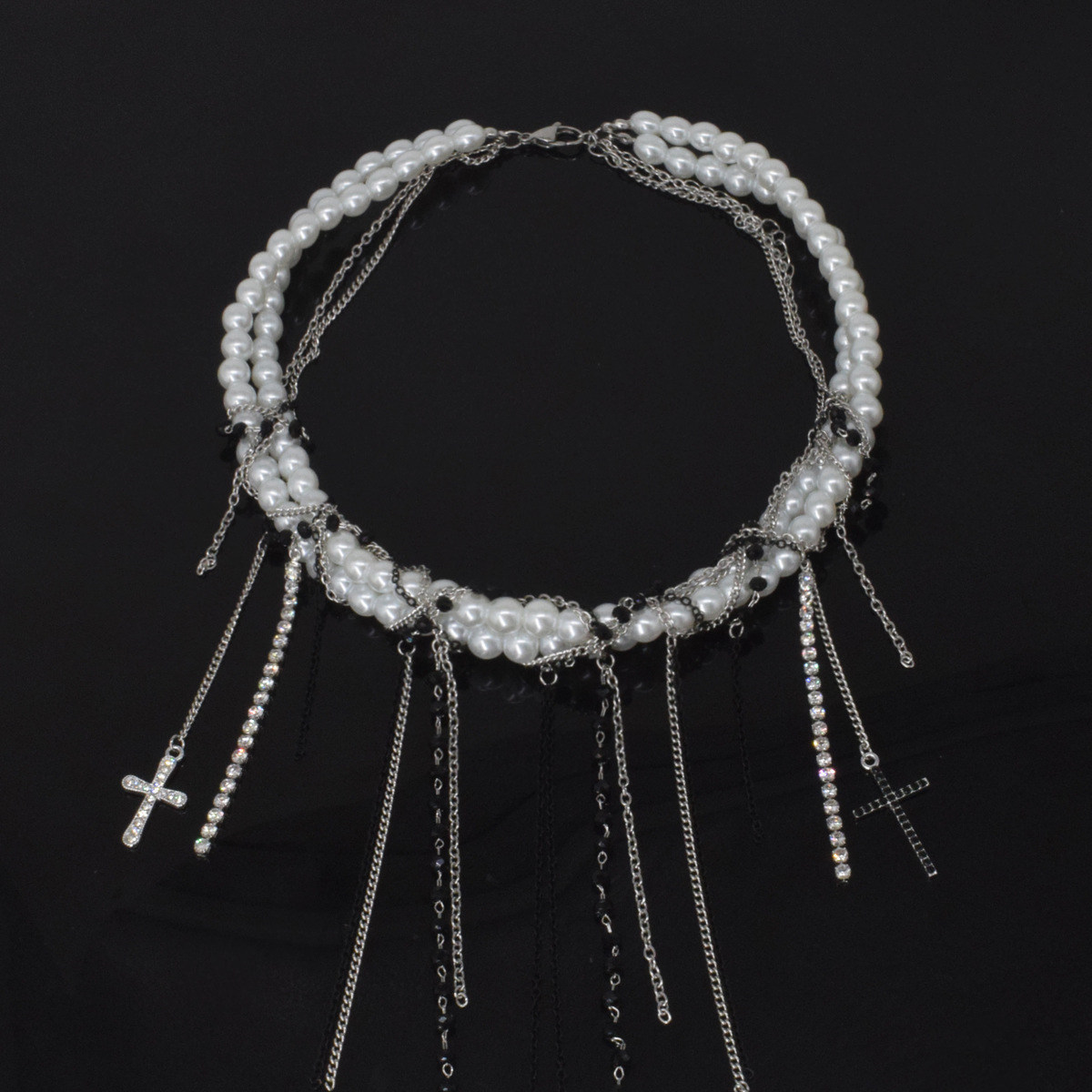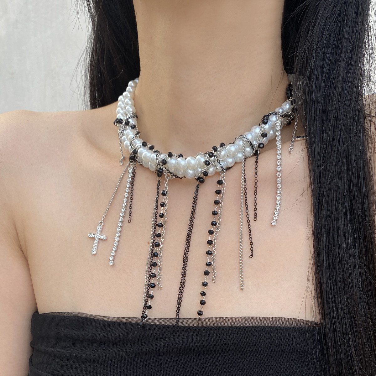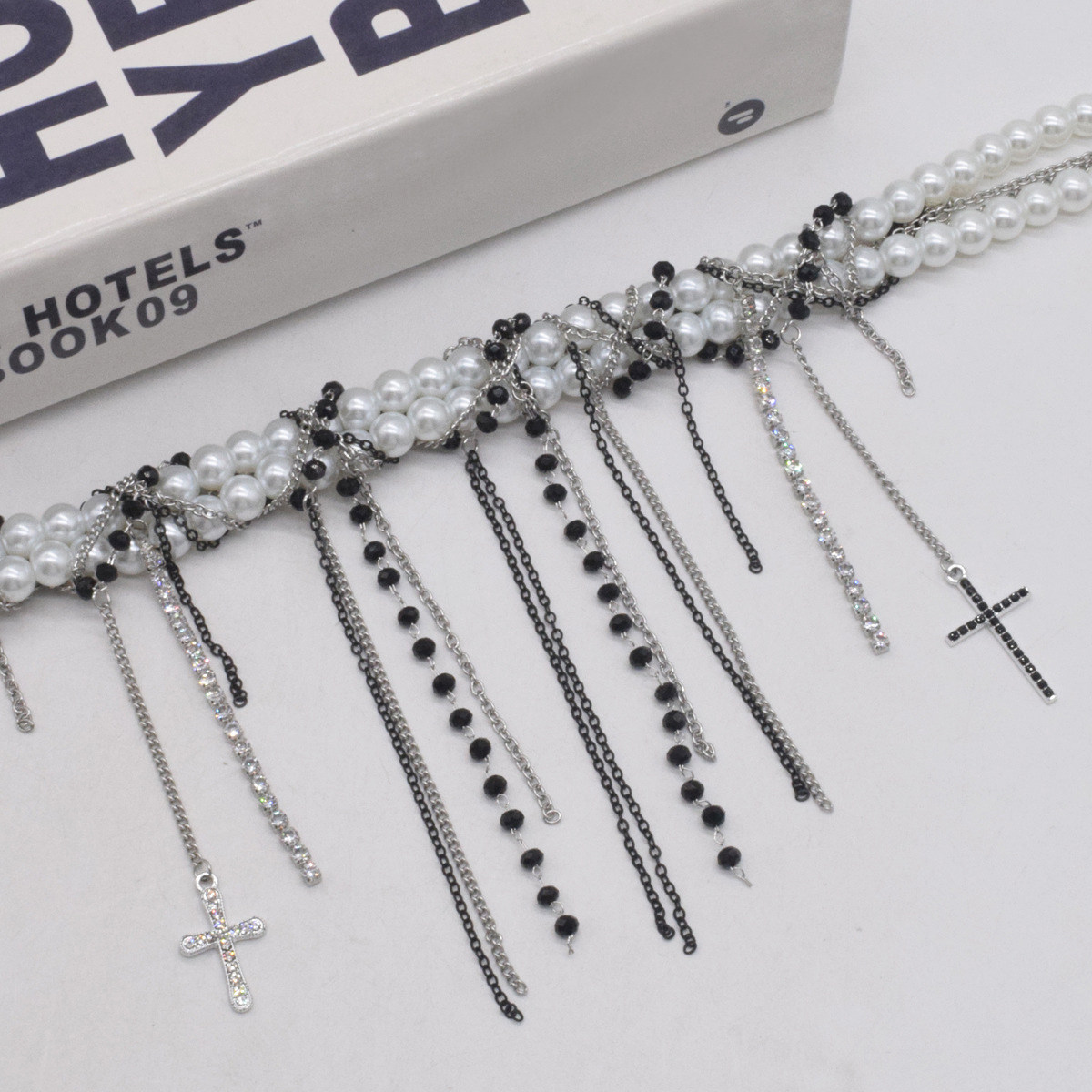 暗黑风镶钻十字架多层流苏项链缠绕串珠锁骨链朋克秋冬choker颈链