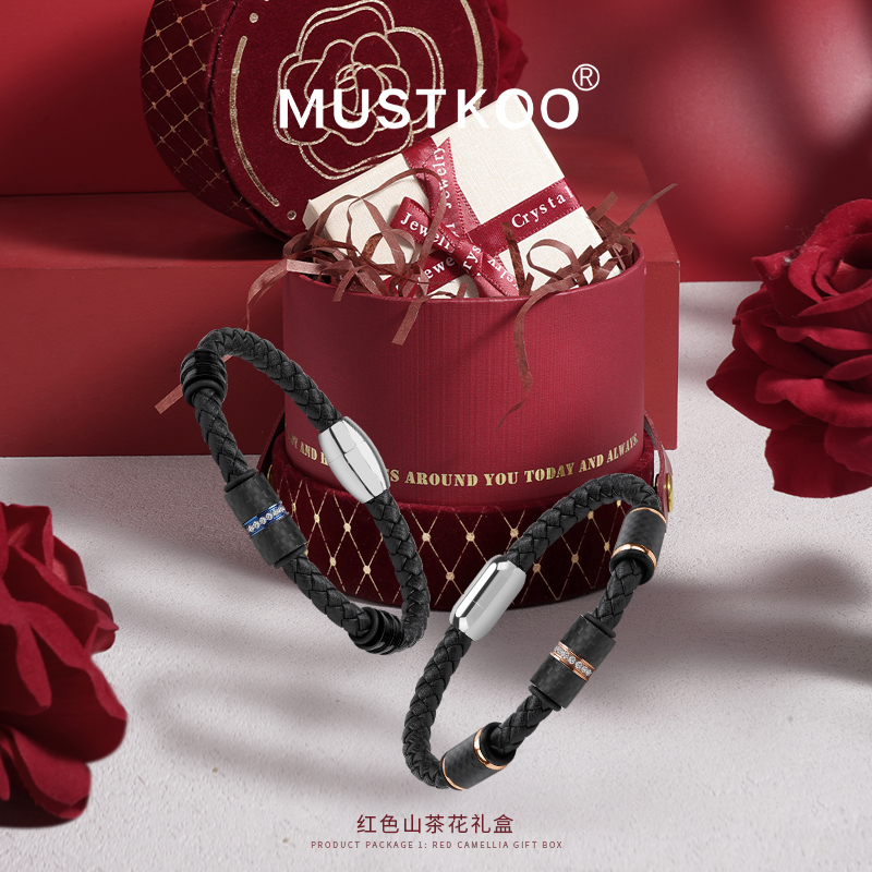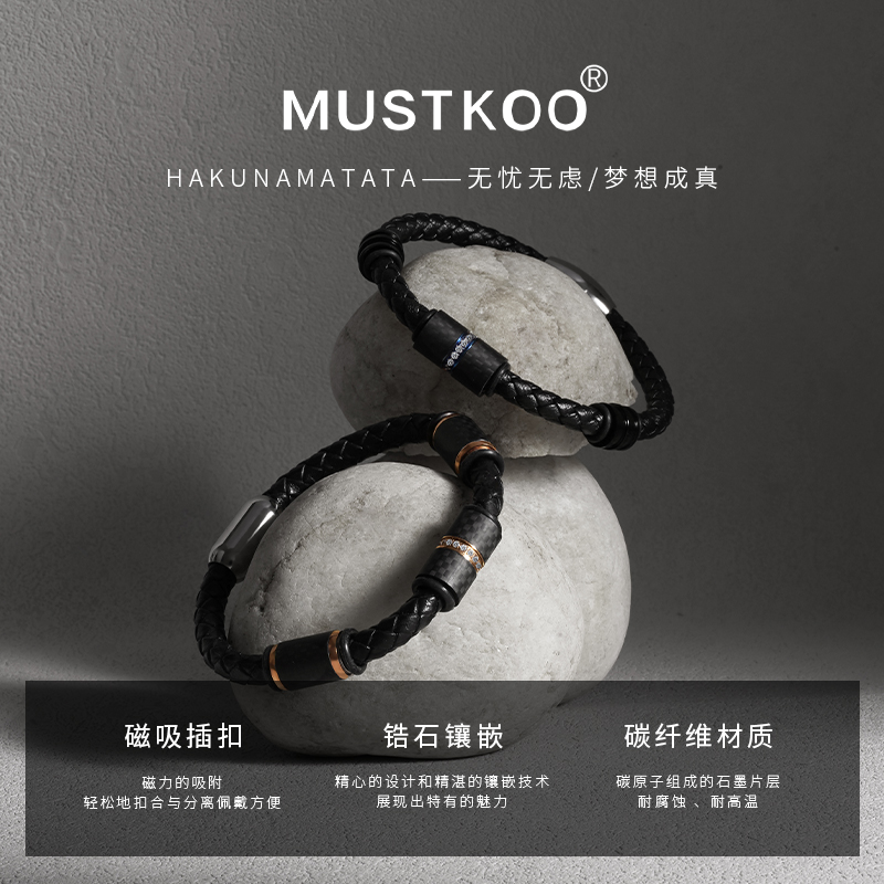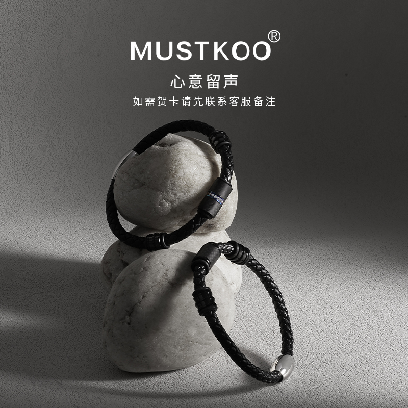 MUSTKOO玛诗杜皮革编织手绳钛钢转运珠幸运手镯 黑色情侣手链礼物