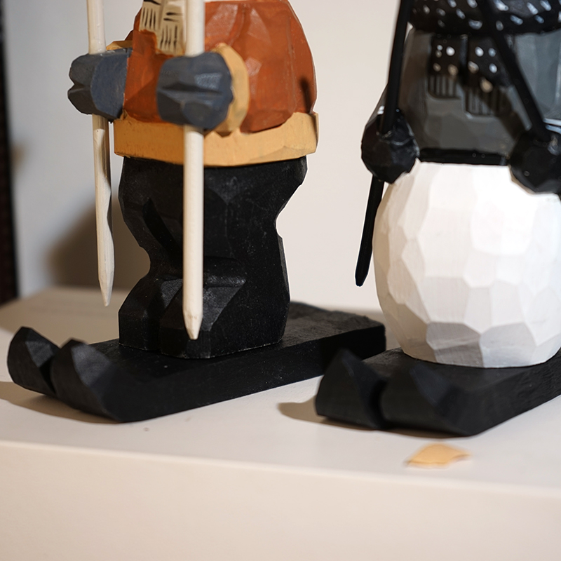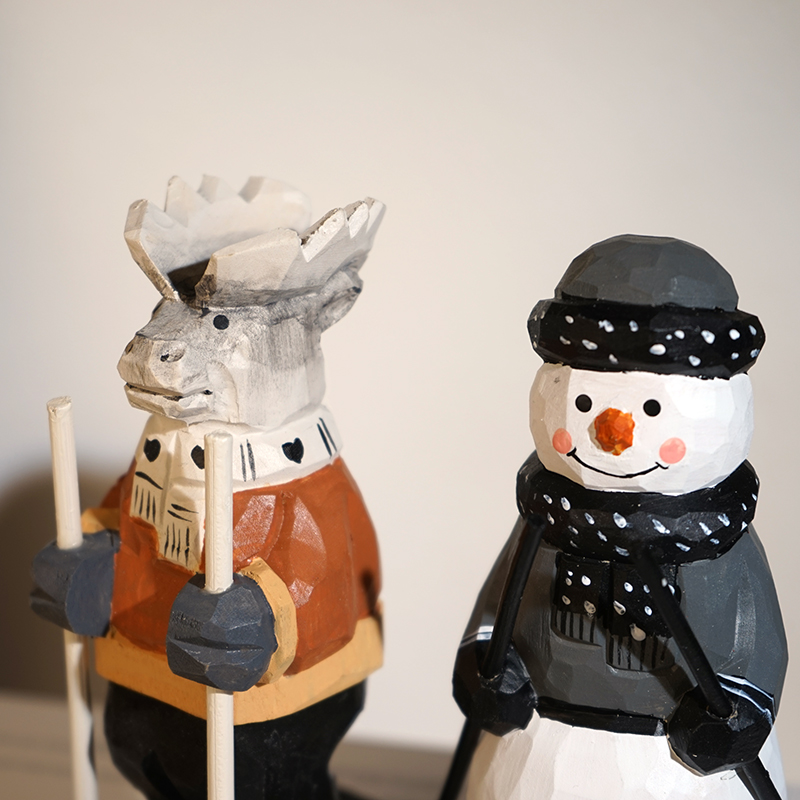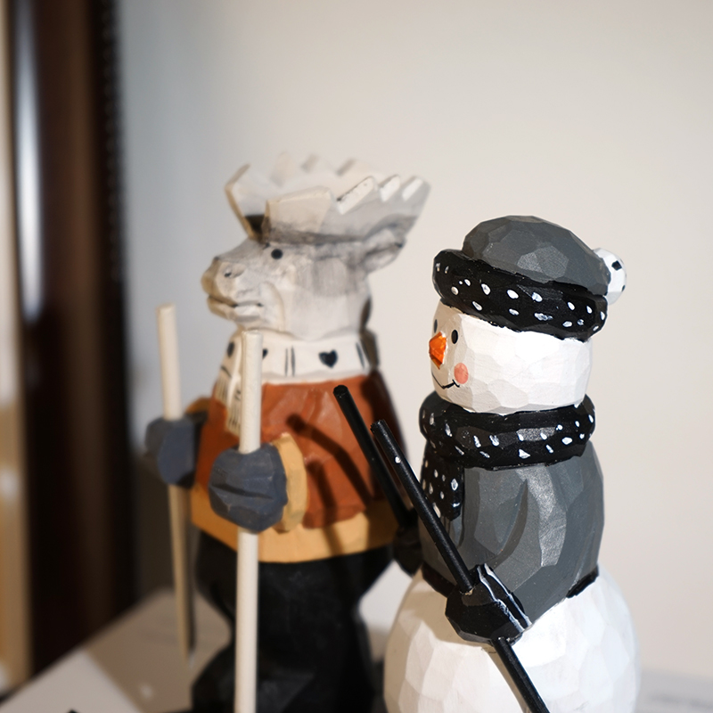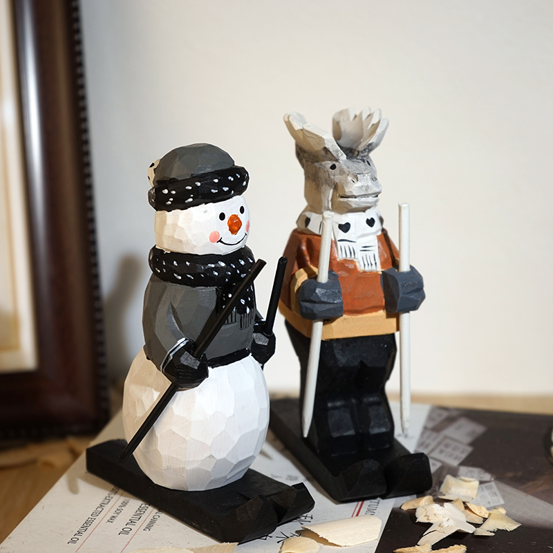 麋鹿雪人滑雪橇手工木雕小摆件卡通可爱工位桌面趣味摆放装饰品