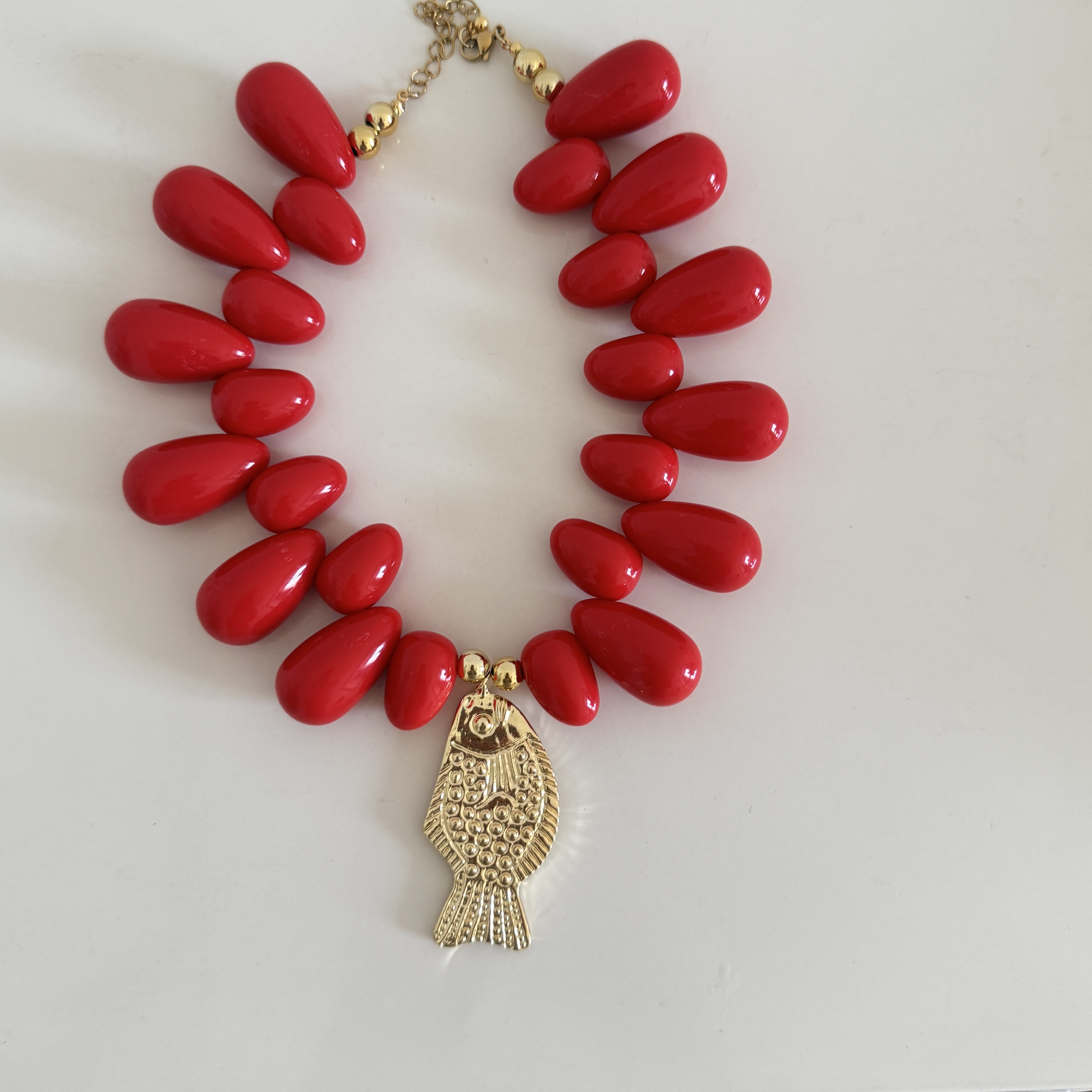 欧美复古红色水滴串珠项链女款高级感夸张浮雕金属鱼形吊坠锁骨链