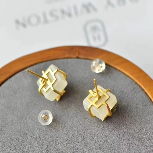 新款原创纯银镀金耳钉女天然和田玉方糖蝴蝶结耳环耳饰
