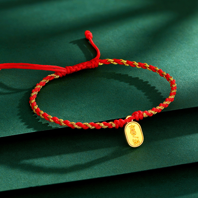 梦金园喜乐平安小方牌克重盲盒本命红绳手串金牌足金手链配绳礼物