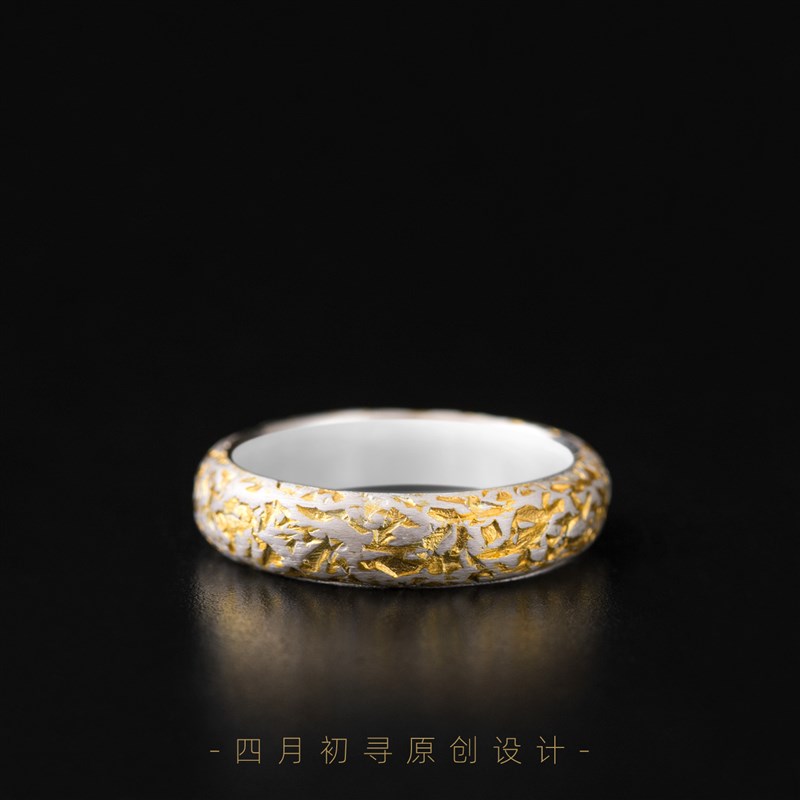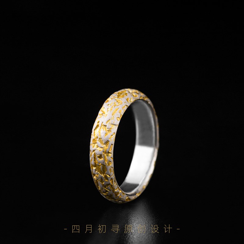 四月初寻金银错纯银戒指情侣对戒女闭口男士食指戒情侣银镶金礼物