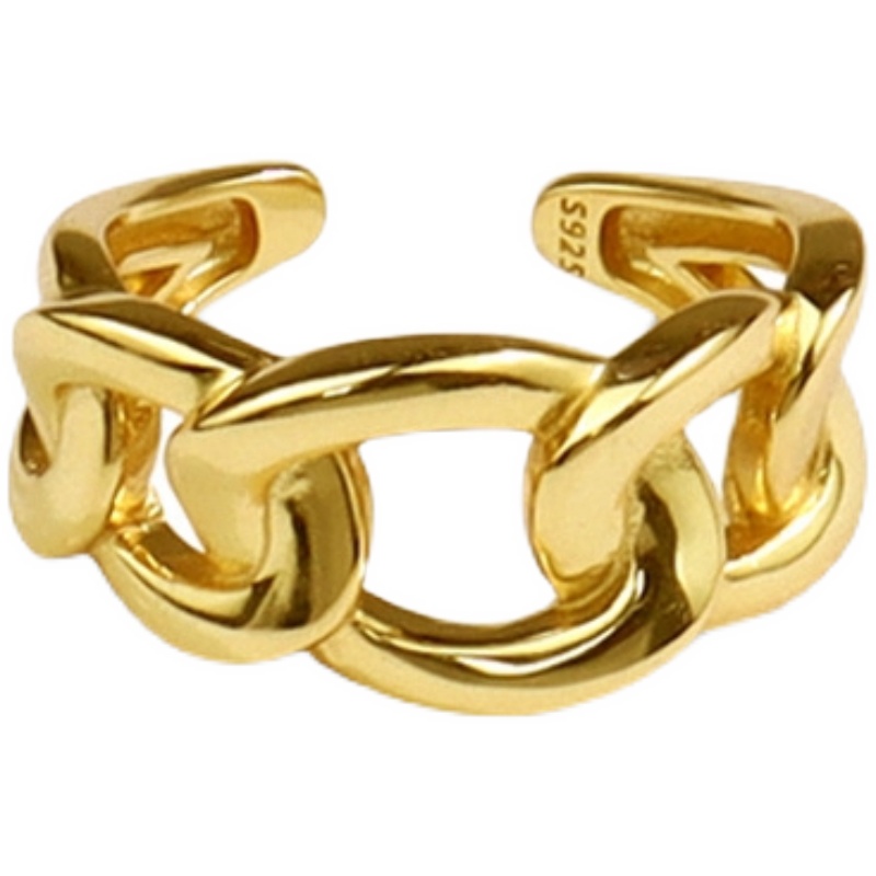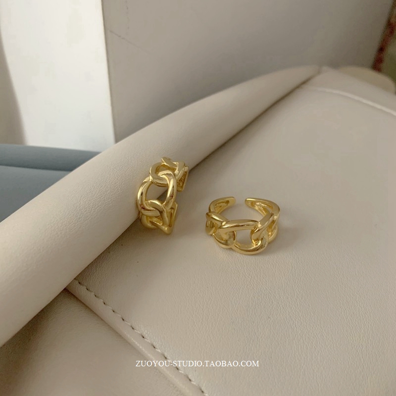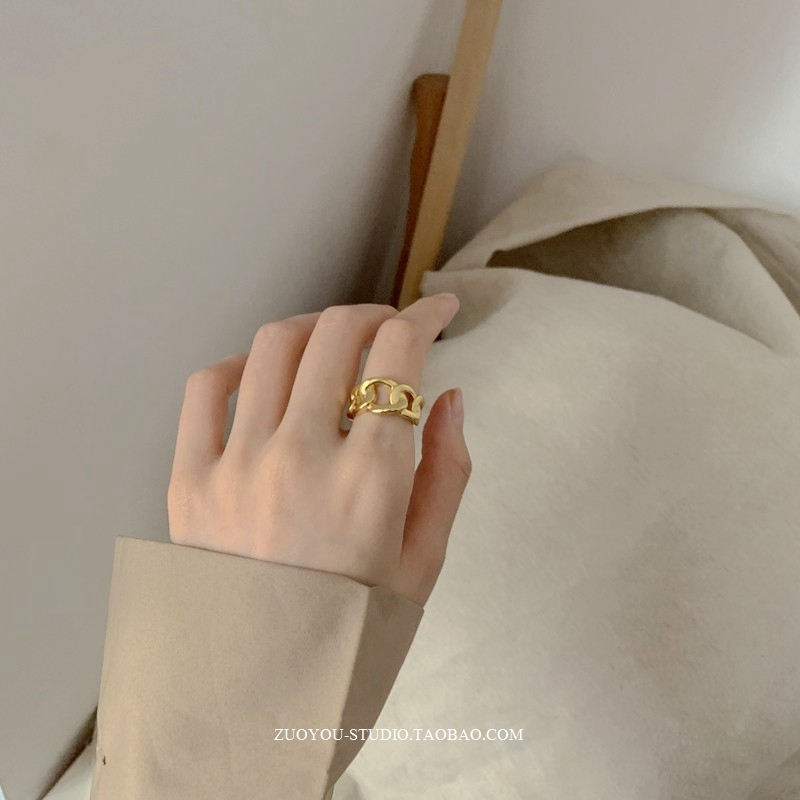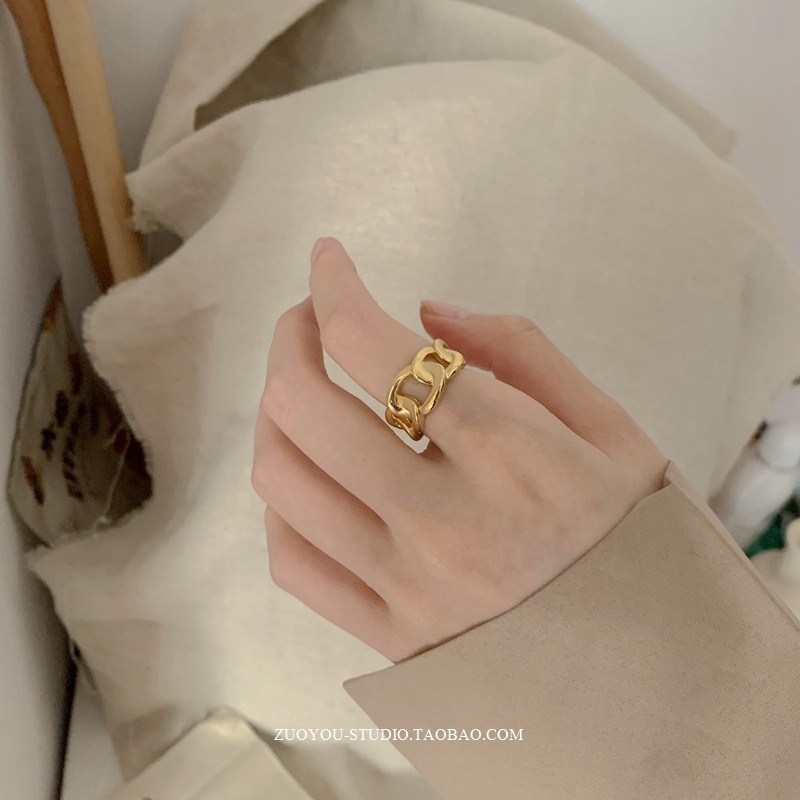 黄铜不掉色小众冷淡风INS潮简约百搭个性气质宽版链条18k金戒指女