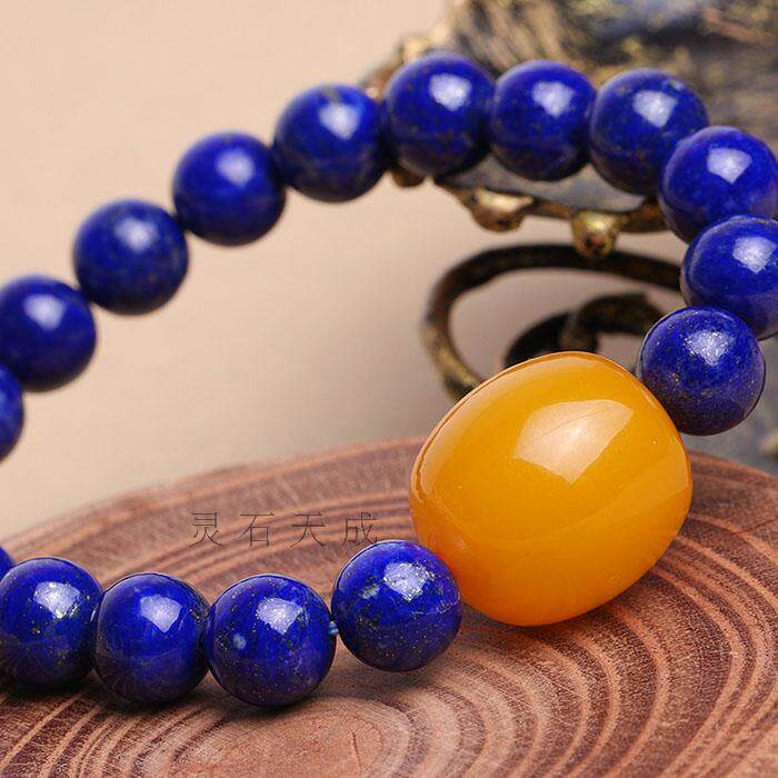 天然青金石手链 配蜜蜡琥珀手串 单圈帝王青金石圆珠手链