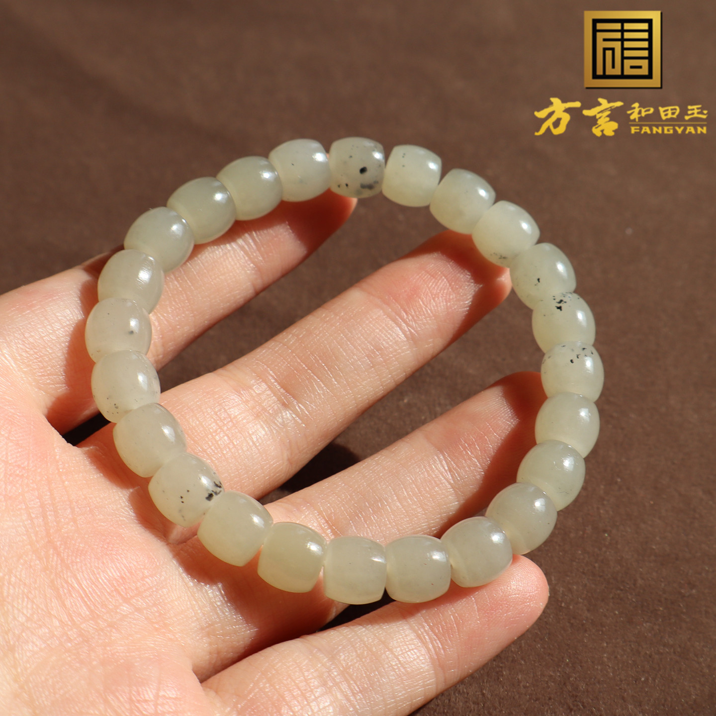 巨漏方言品牌和田玉新疆羊脂白玉底点墨青花籽料卡8mm直切手串A2
