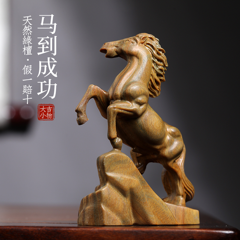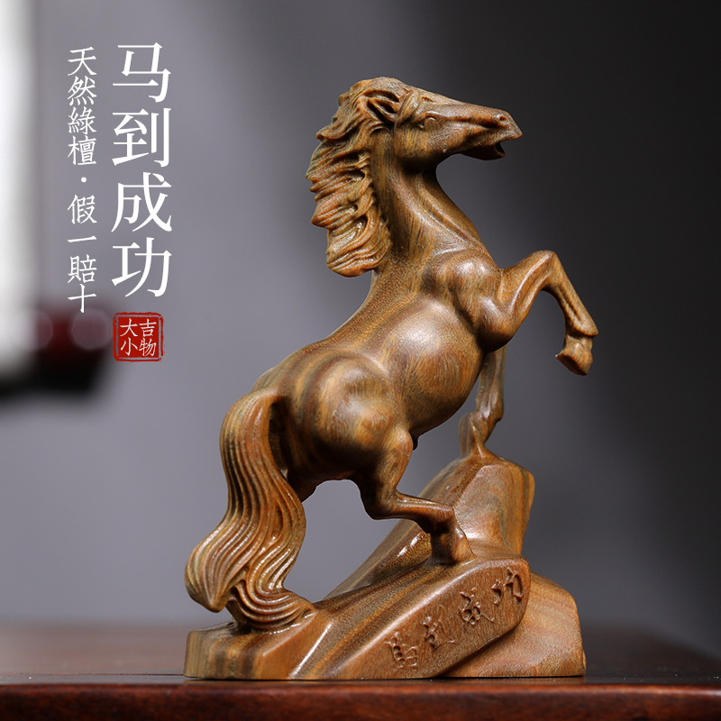 天然绿檀木雕马到成功绿檀木雕刻生肖马文玩手把件桌面新中式摆件