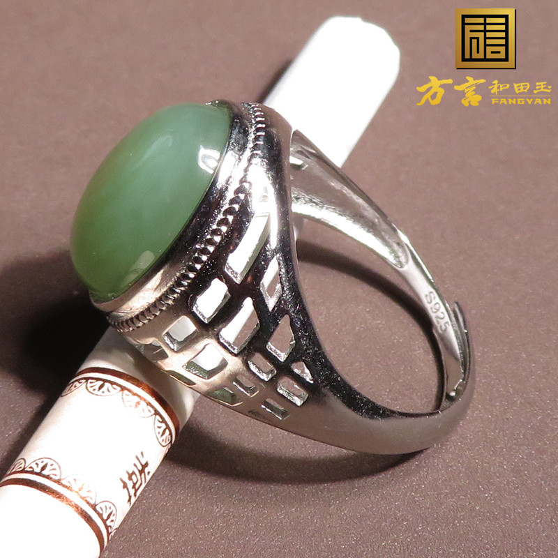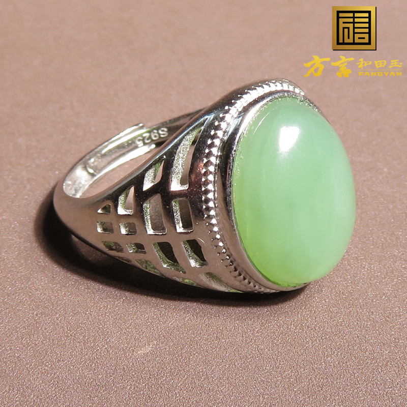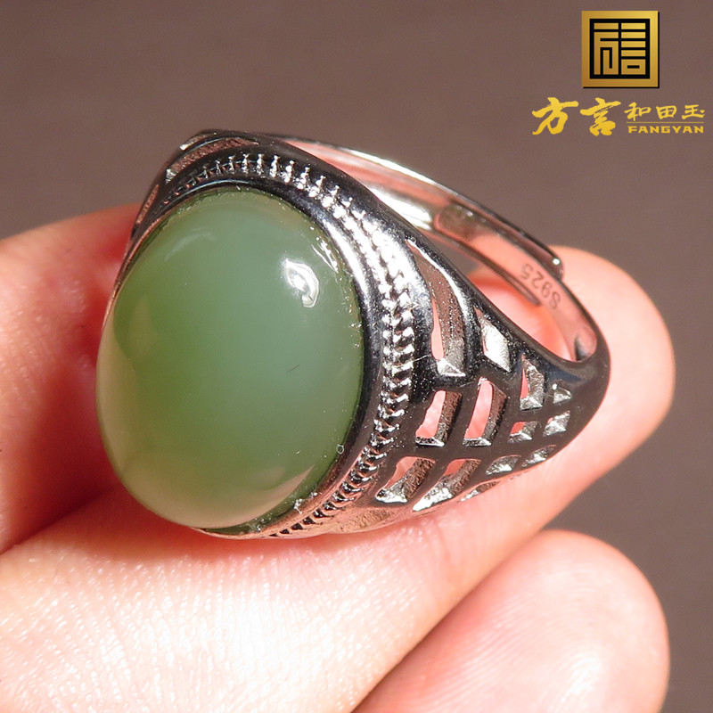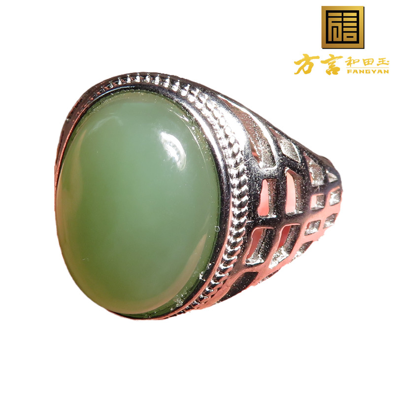方言和田玉精品特惠俄料细腻碧玉鸭蛋青925银镶玉男士戒指X
