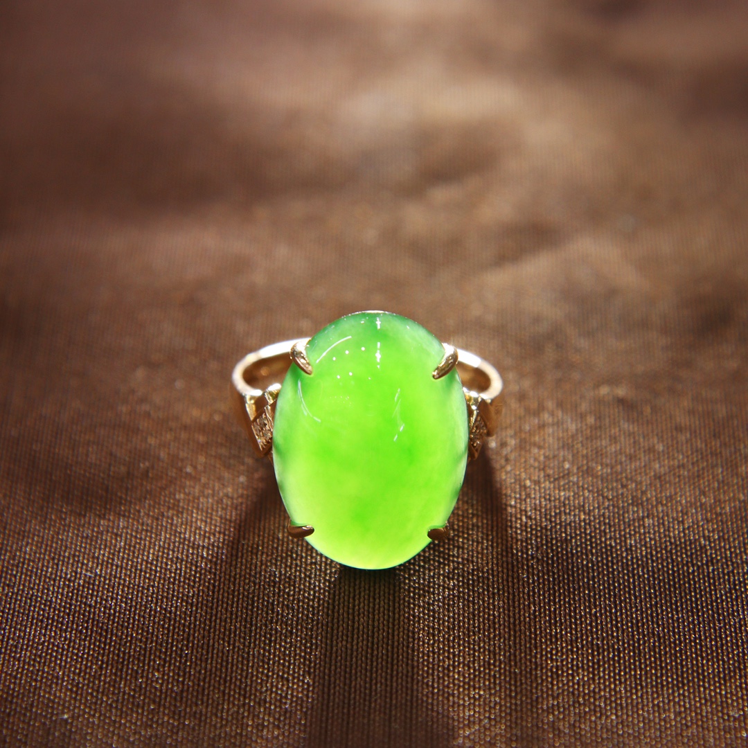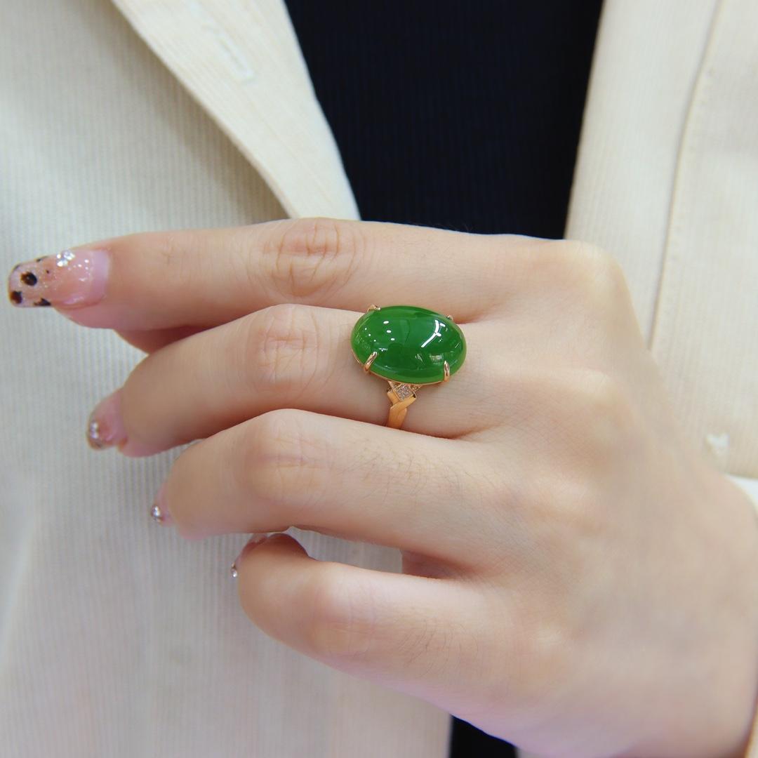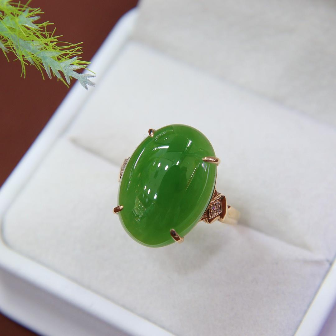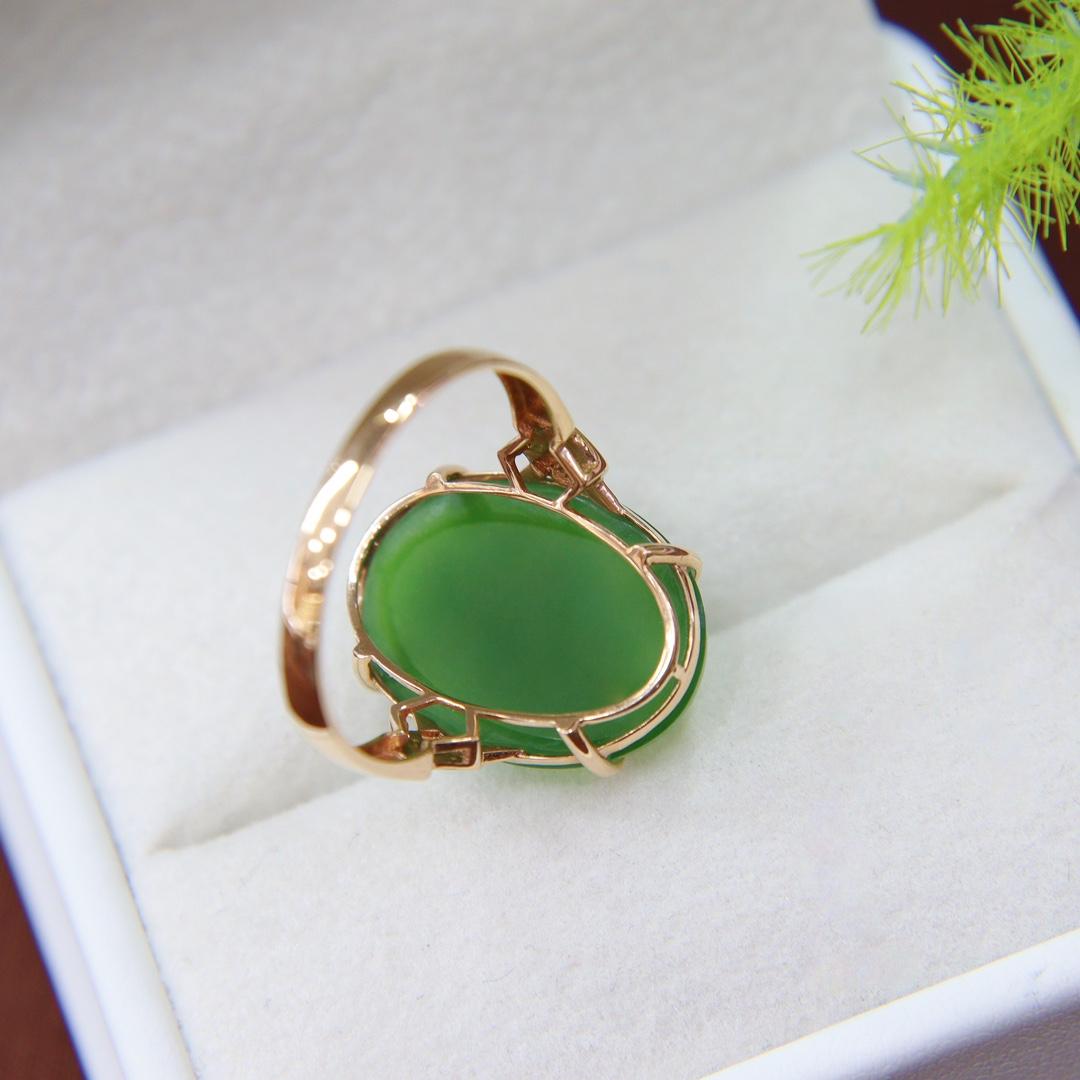 双旦新品天然和田玉戒指女a货菠菜绿碧玉蛋面镶嵌18k金指环送妈妈