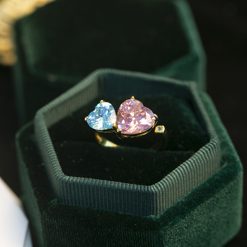 Toi et Moi 恋人戒指个性浪漫圣玛利亚浅海蓝色粉钻戒指双爱心戒