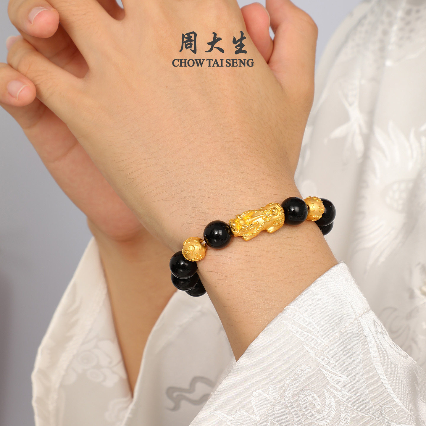【圣诞礼物】周大生黄金貔貅手链男款转运珠金珠黑曜石男士手串