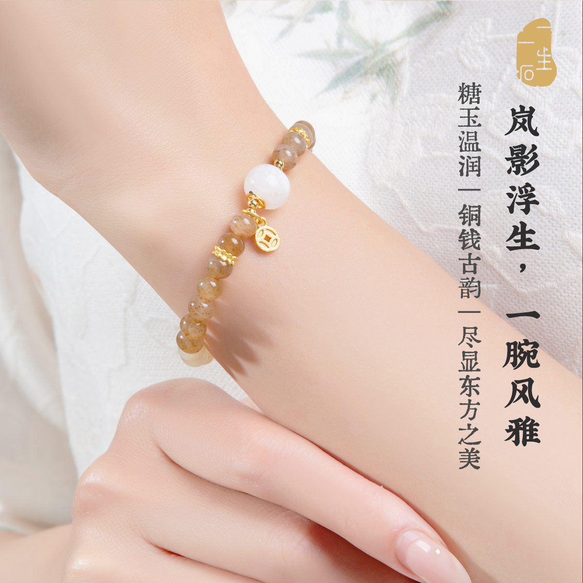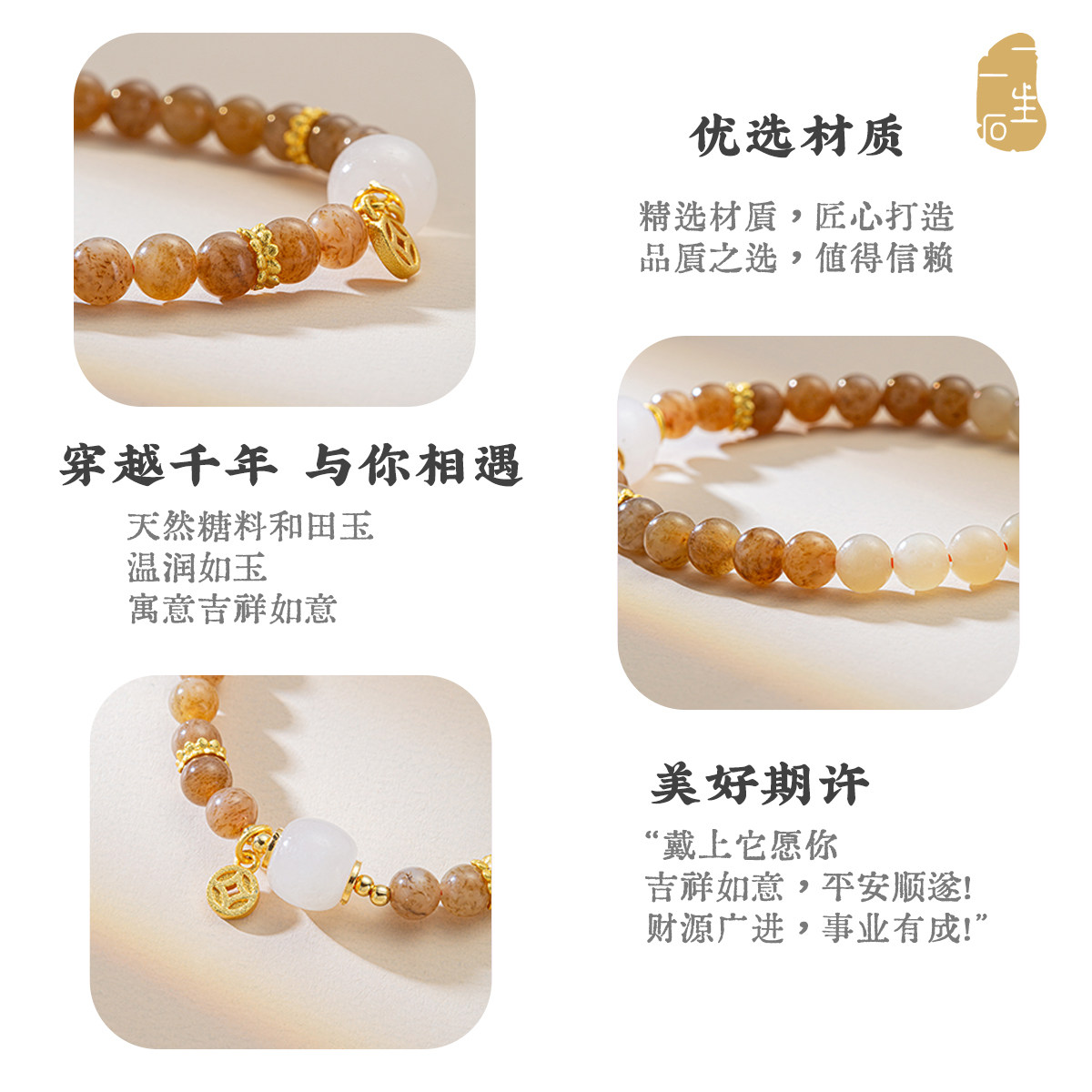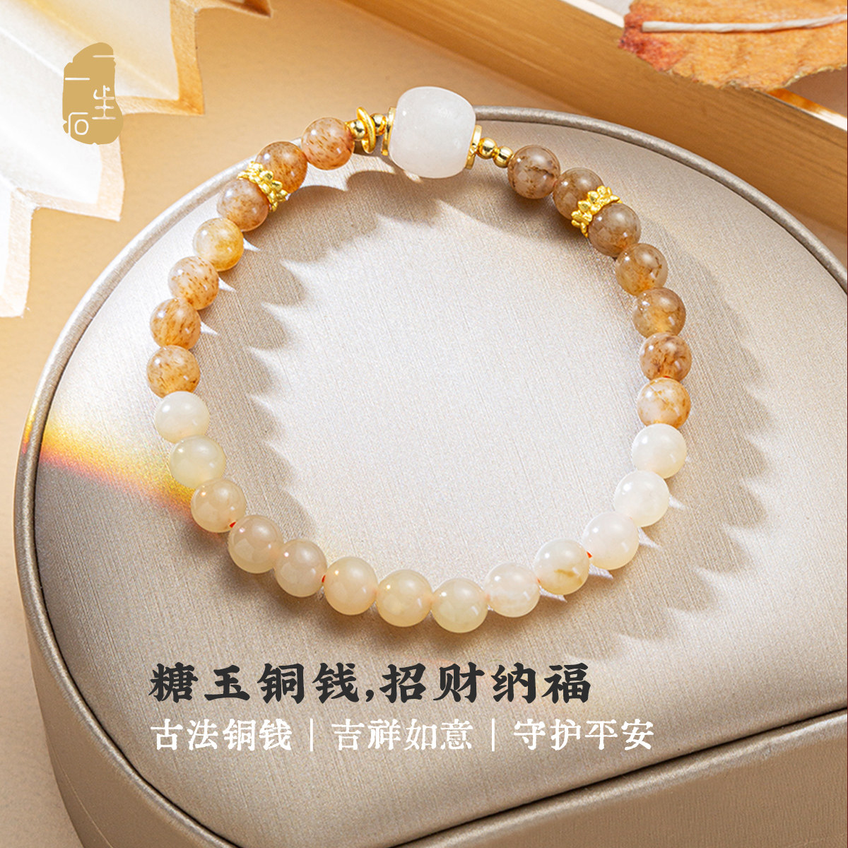 一生一石天然手链糖料和田玉铜钱手串小众精致好运手串礼物