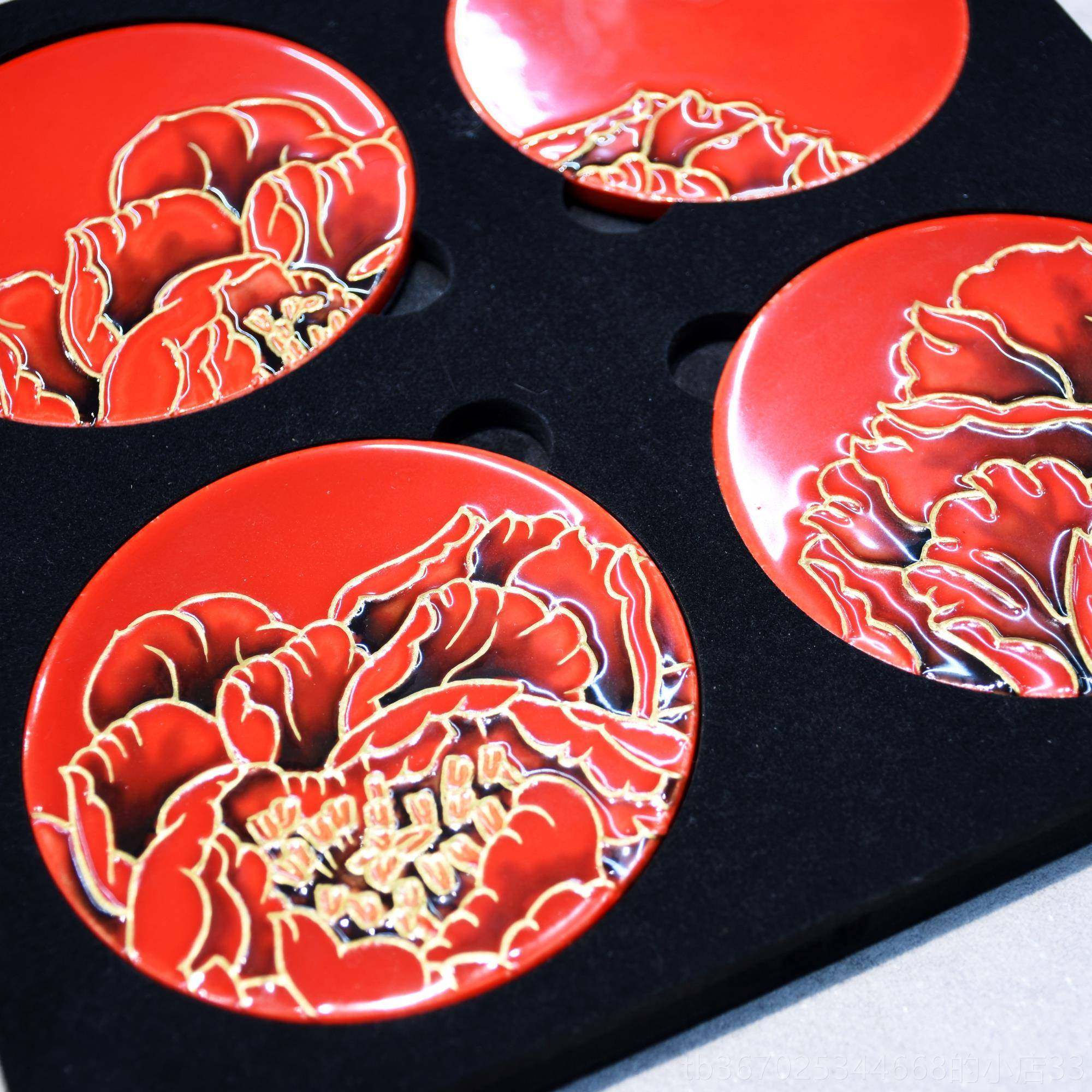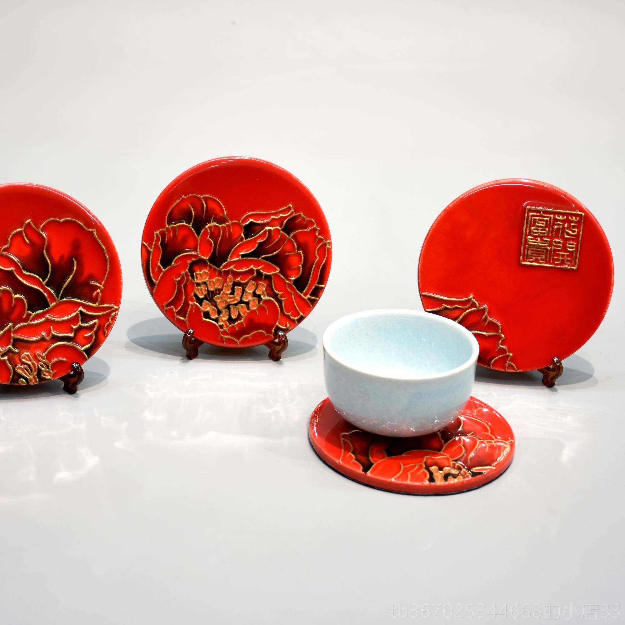 正品彩艺原创餐《鎏牡丹》手工陶瓷隔热杯垫桌洛阳特三色自用金送