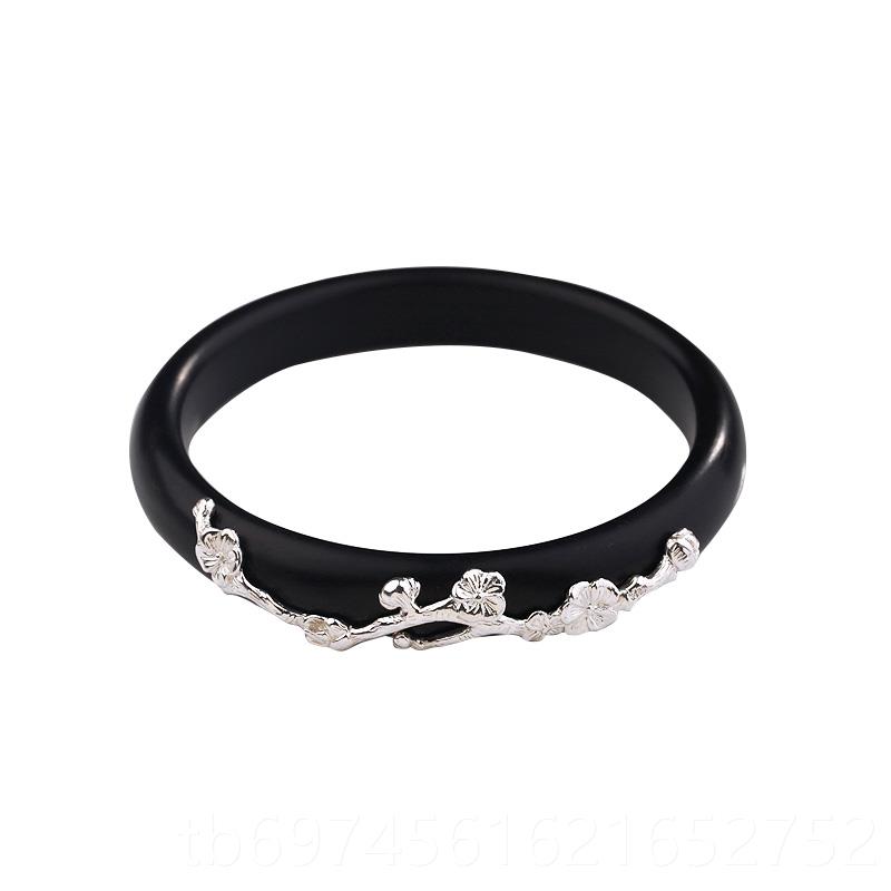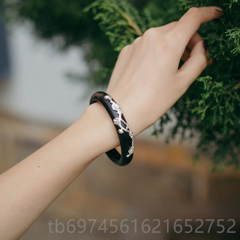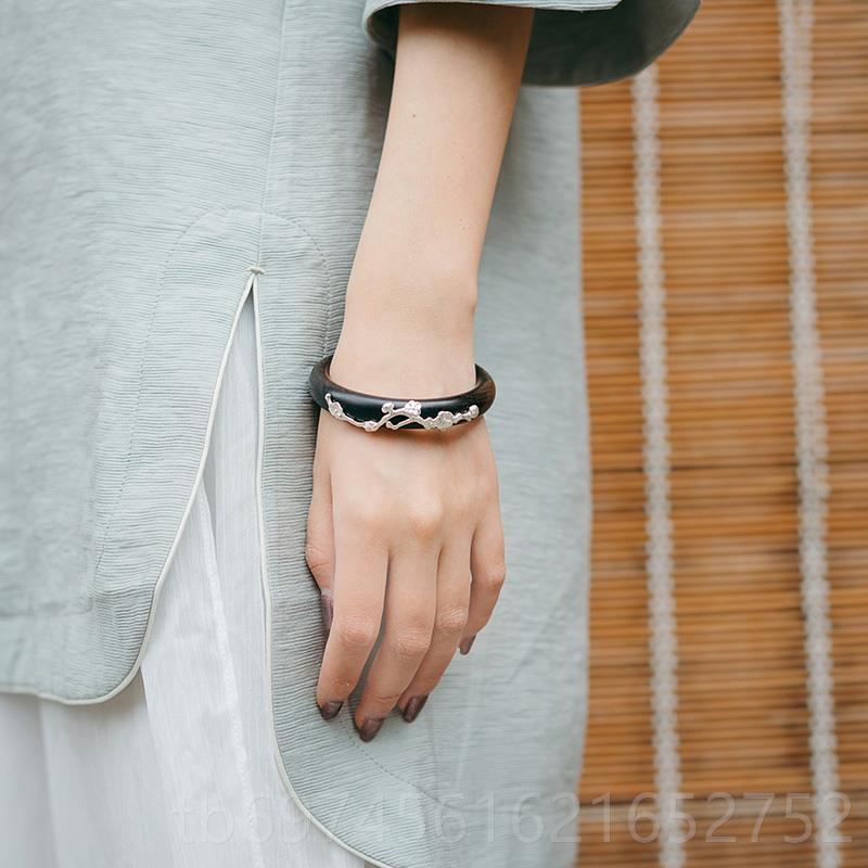 新款熙素原创檀镯木手镯女纯银梅花镶嵌然黑檀天木镶银礼手手环饰