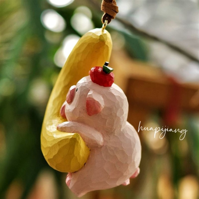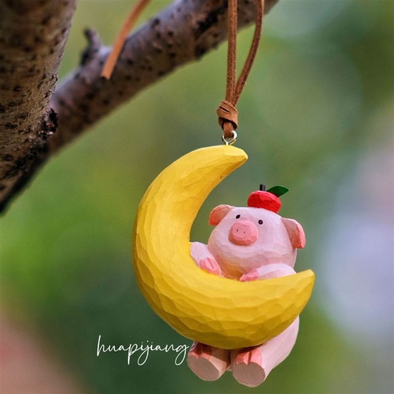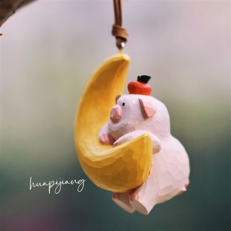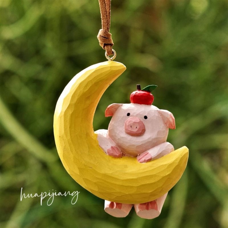 月亮小猪诸事顺利手工木雕汽车背包挂件创意车挂件汽车后视镜装饰