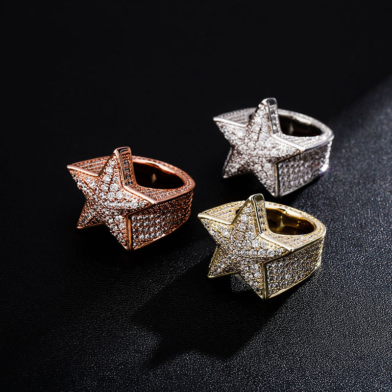 ins欧美嘻哈夸张个性爆款ice out满锆石五角星潮男星星戒指hiphop