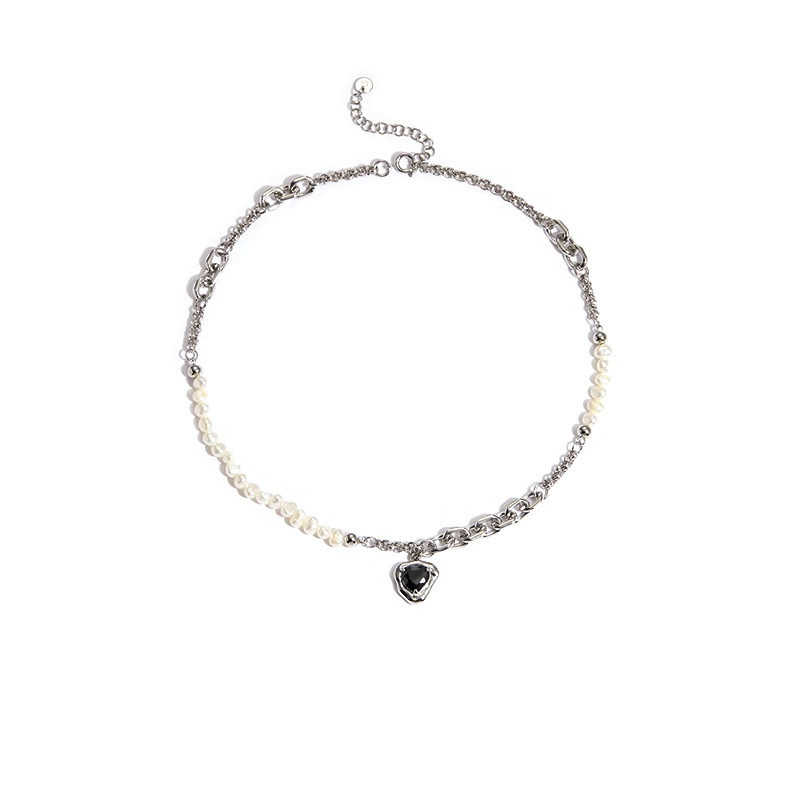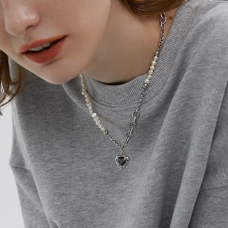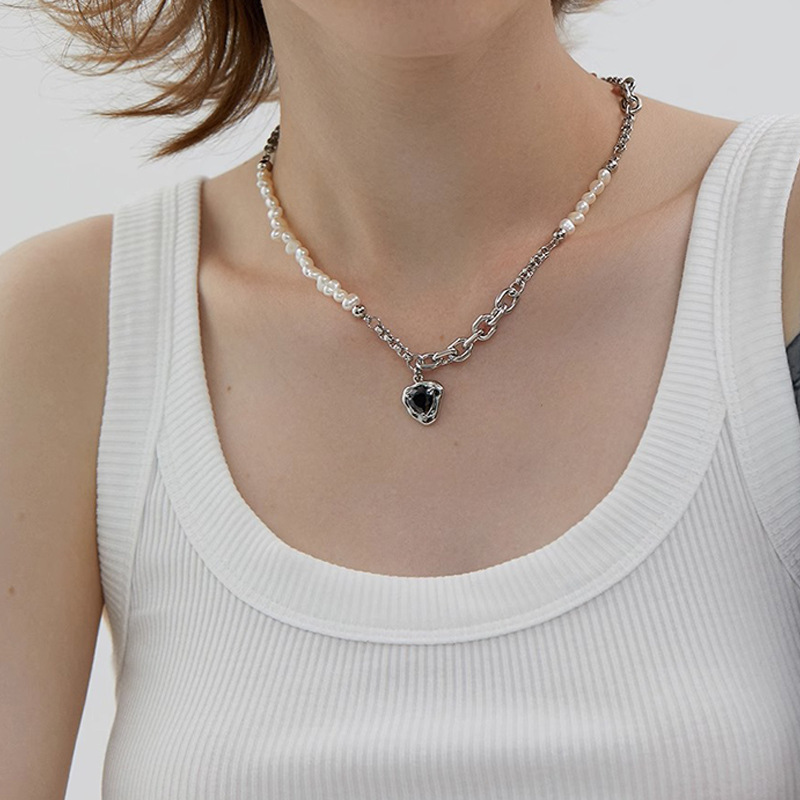 甜酷时髦休闲链条珍珠爱心项链女黑色中性拼接毛衣链2024年新款潮