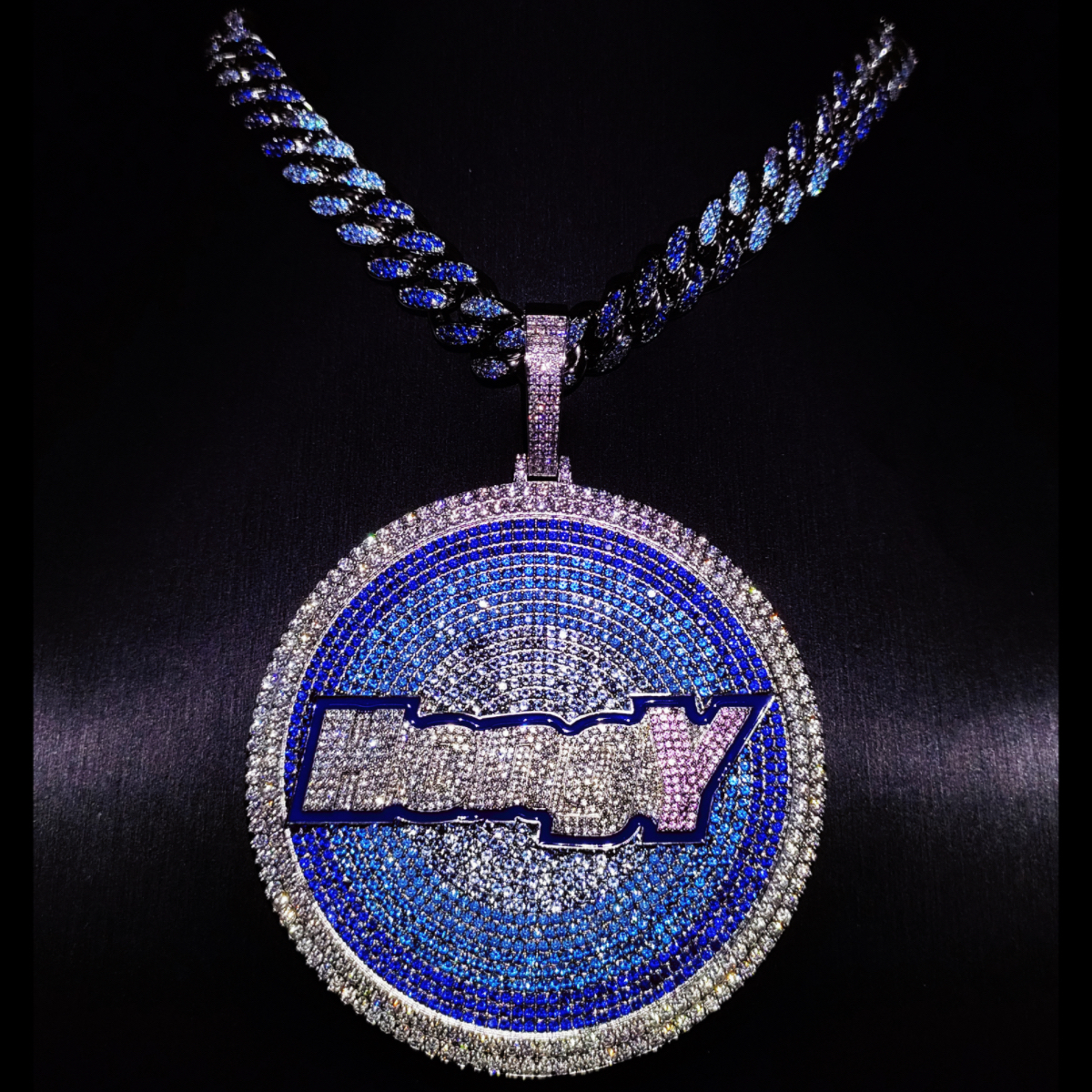 Mr.Blingggggg欧美嘻哈珠宝 私人定制渐变蓝色古巴链搭配圆盘吊坠