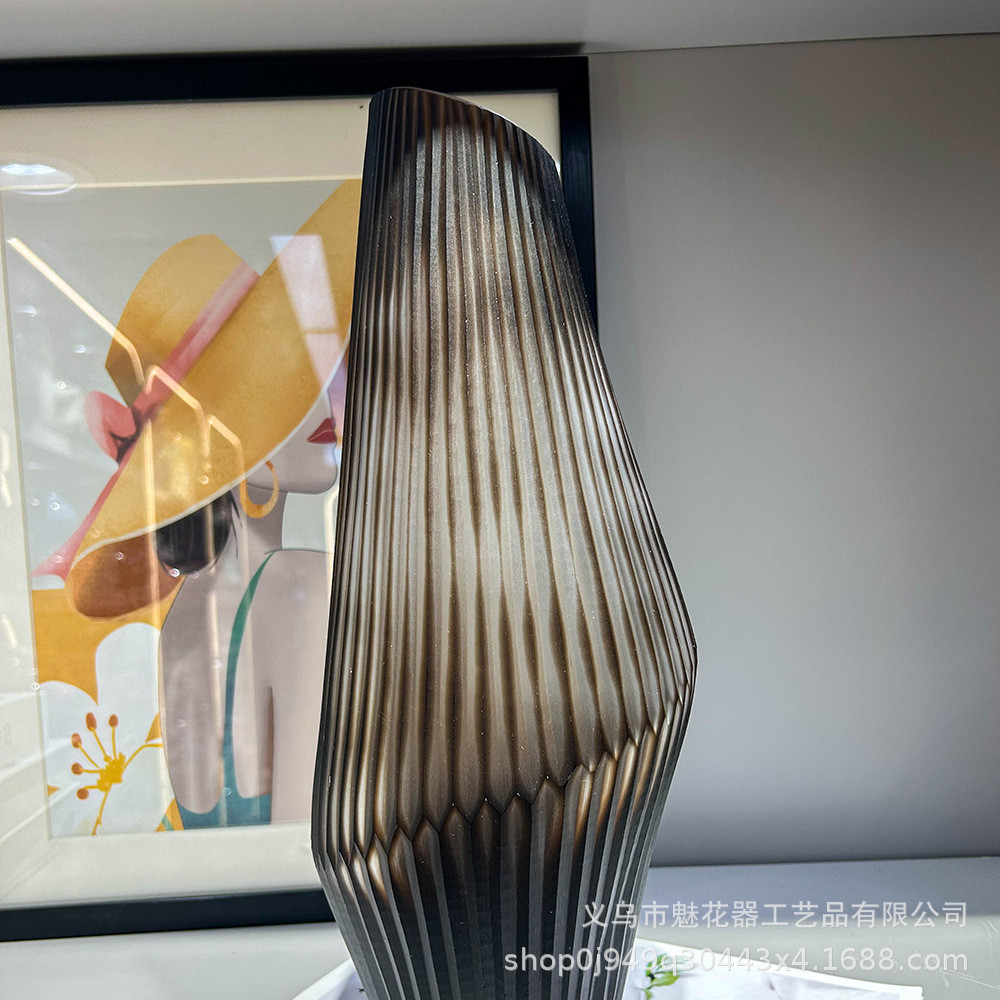 轻奢现代异形磨刻琉璃样板间花瓶摆件插花器竖条纹会议室插花高级